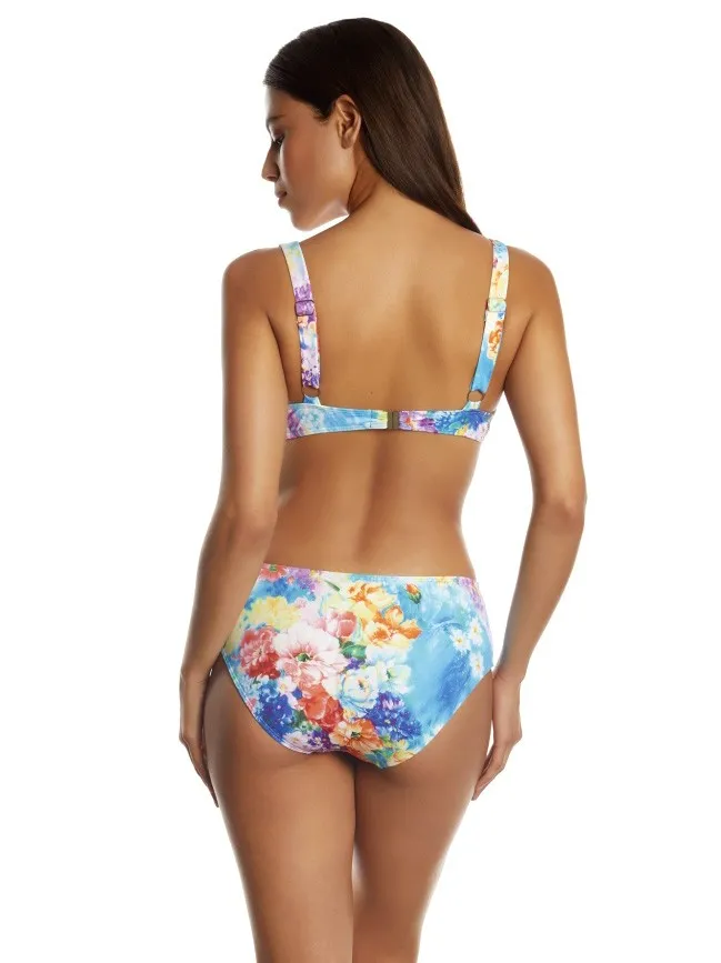 Испанский раздельный купальник с защитой от ультрафиолета Докор Пейнтед Гарден с чашкой D, с ярким цветочным принтом, фактор защиты: UPF 50+ - Docor Painted Garden 1002 D 115. Мягкая чашка на косточках с диагональным швом создана специально для большой груди, хорошо приподнимает, поддерживает и создает красивую, естественную форму. Боковые поддерживающие панели направляют грудь к центру, а центральная панель разделяет грудь за счет широко расставленных косточек. Широкие бретели с регулировкой длины на золотистой металлической фурнитуре. В комплекте - высокие плавки с драпировкой по линии бедер.