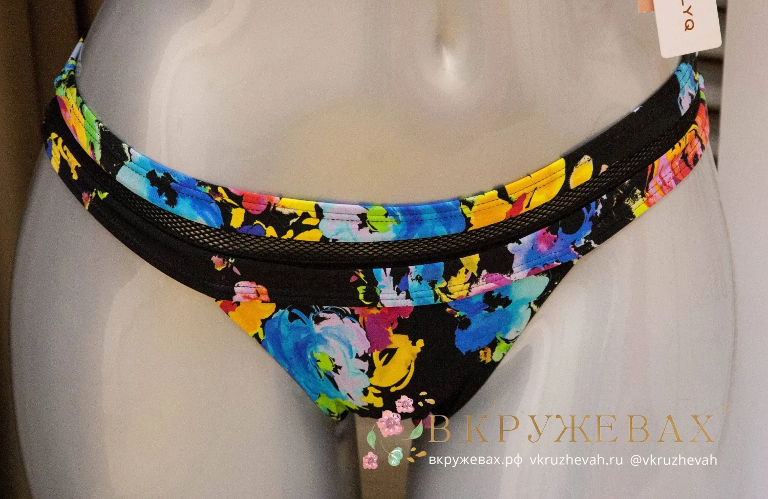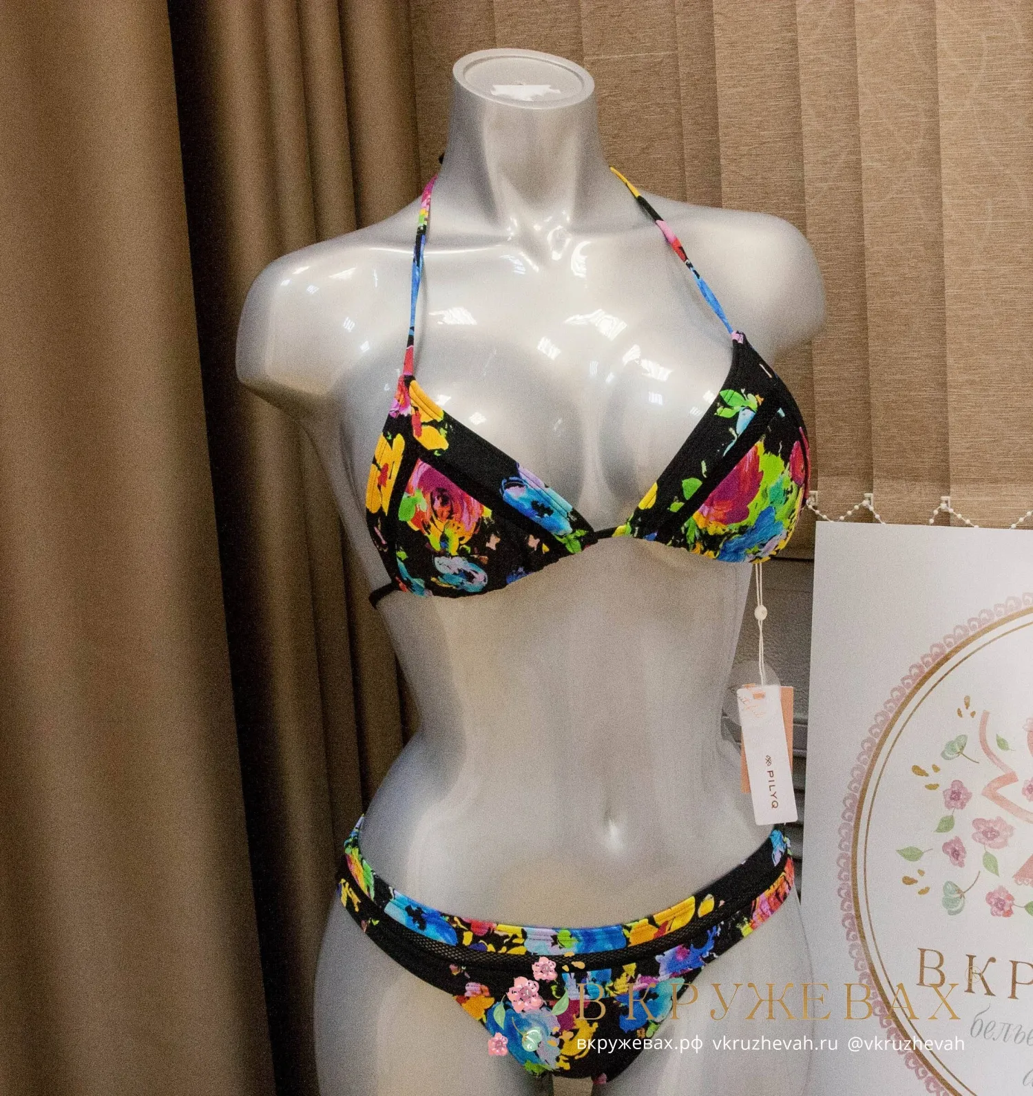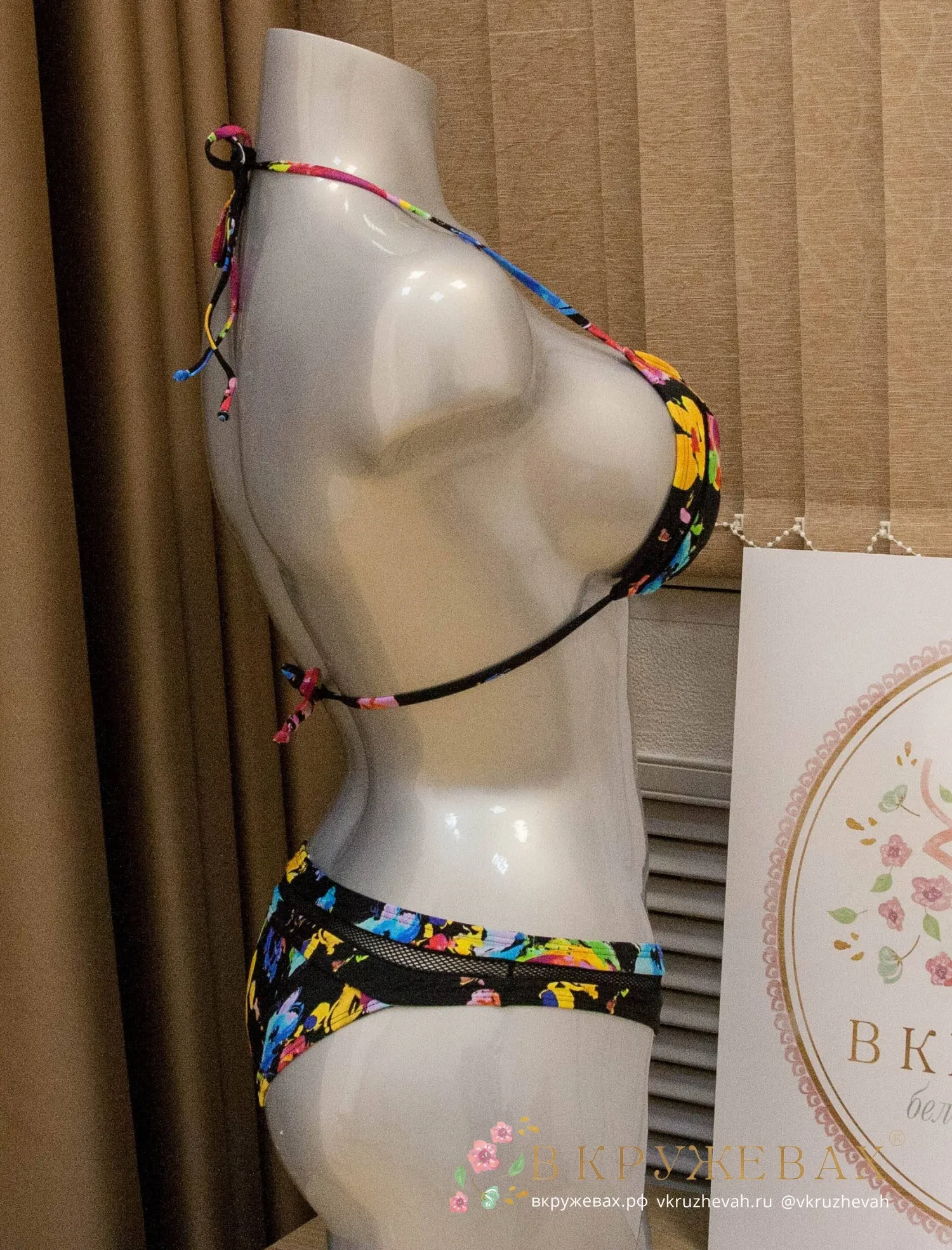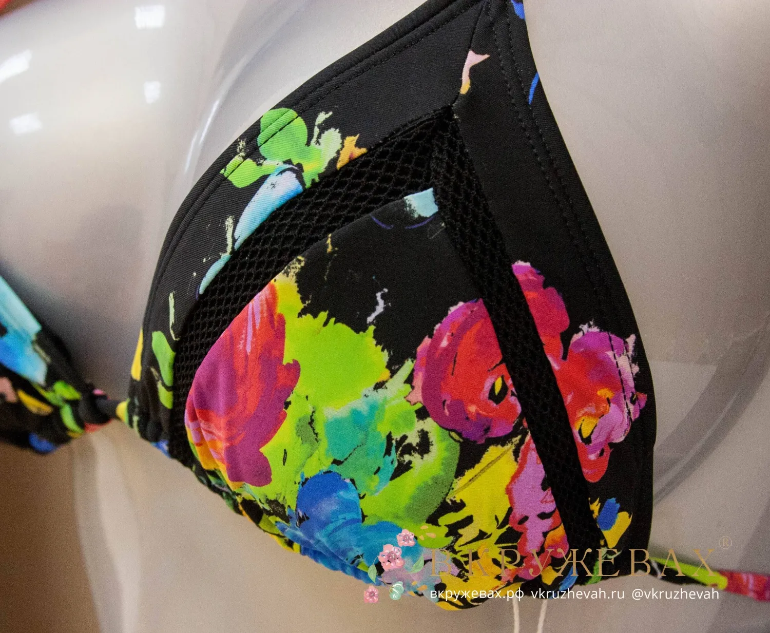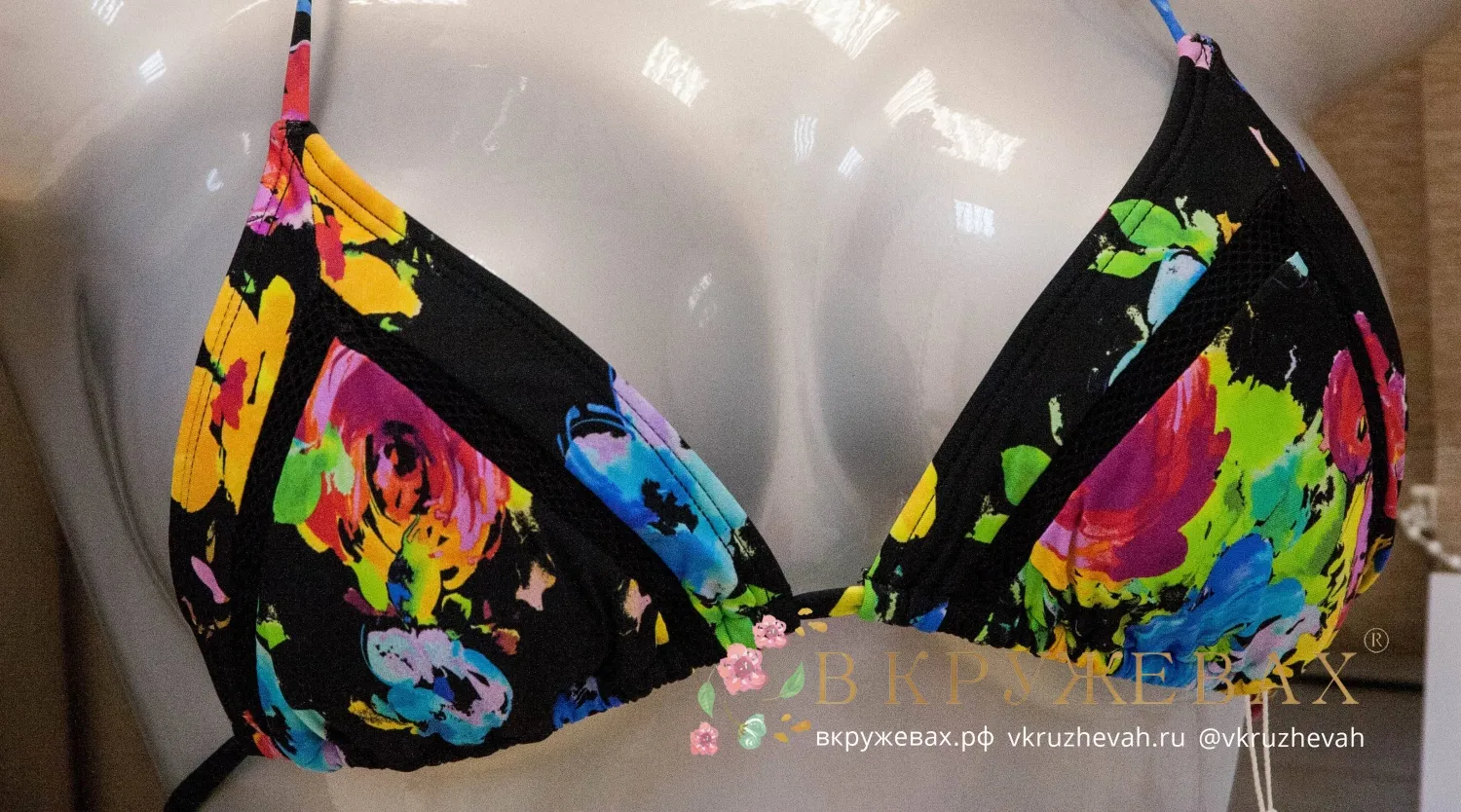 На первых фотографиях купальник не такой сочный, как на самом деле. Цвет у этой модели очень насыщенный, контрастный – он хорошо отражен на фото с манекеном. Также купальник неудачно сидит на модели, т.к. образец купальника без полупоролона. В треугольниках присутствуют хорошие полупоролоновые вкладки, с которыми грудь размеров A, B, C выглядит очень выразительно.