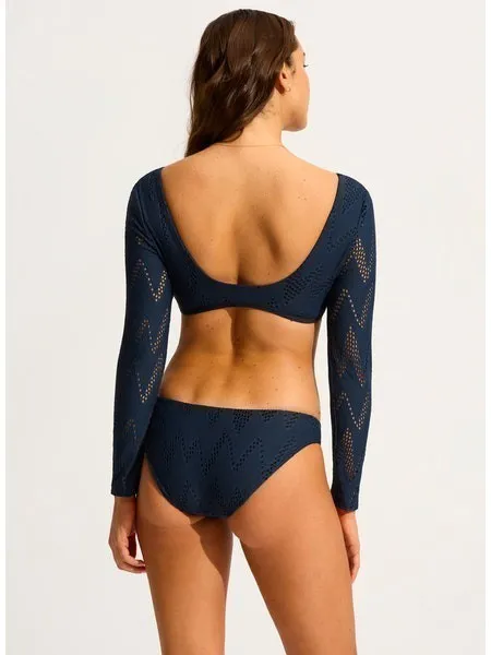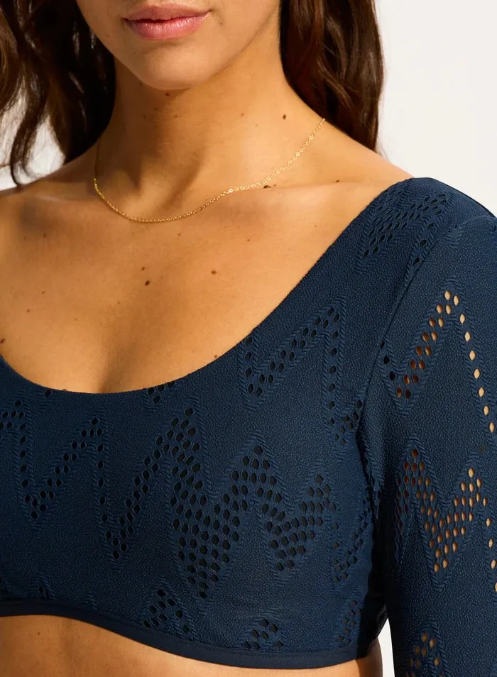 Короткий купальный кроп-топ с длинными рукавами Сифолли Кьяра темно-синего цвета - Seafolly Chiara 60289-093 - true navy. Топ выполнен из необычной текстурной ткани с перфорацией на чёрной подложке. Эффектный волнистый узор. Высококачественная ткань быстро сохнет и долго сохраняет эластичность.