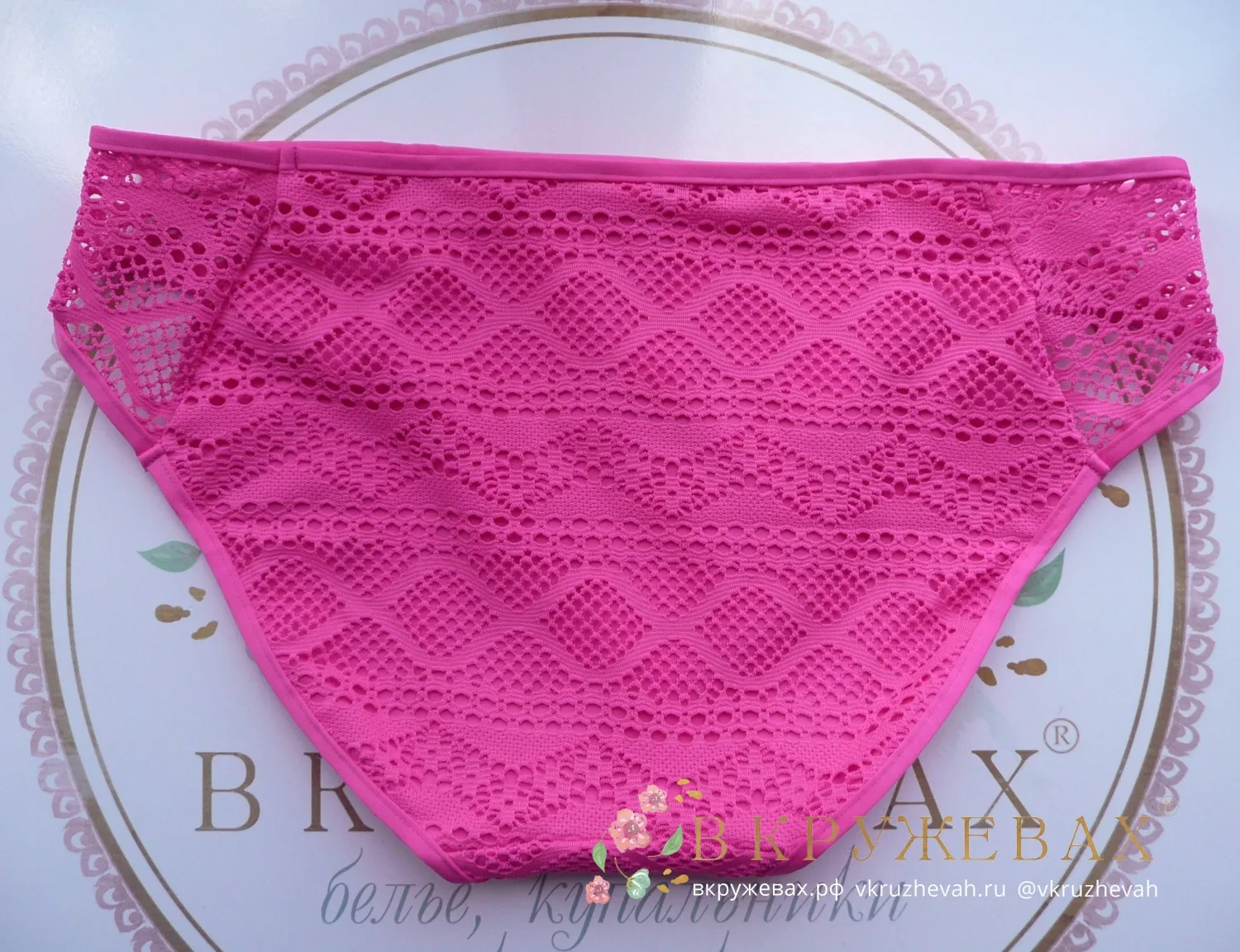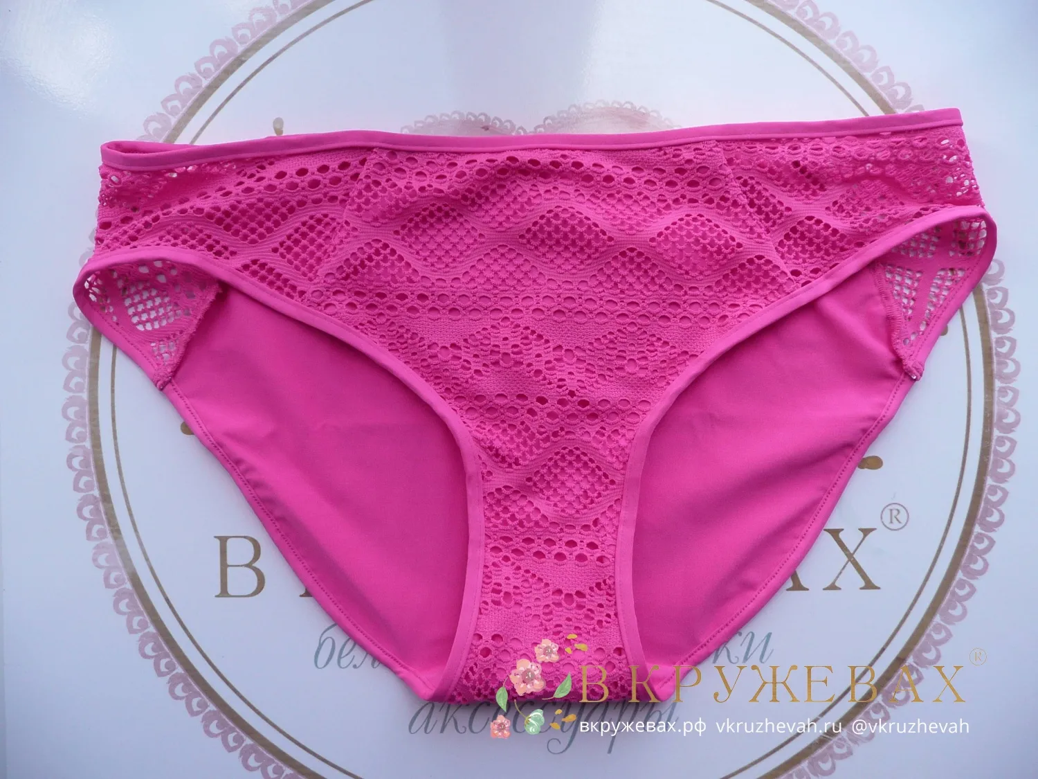 Классические плавки с прозрачными вставками из кружева Фрея Сандэнс ярко-розового цвета фуксия. Выполнены из двухслойного материала: под декоративным кружевным слоем - тонкая и непрозрачная ткань.