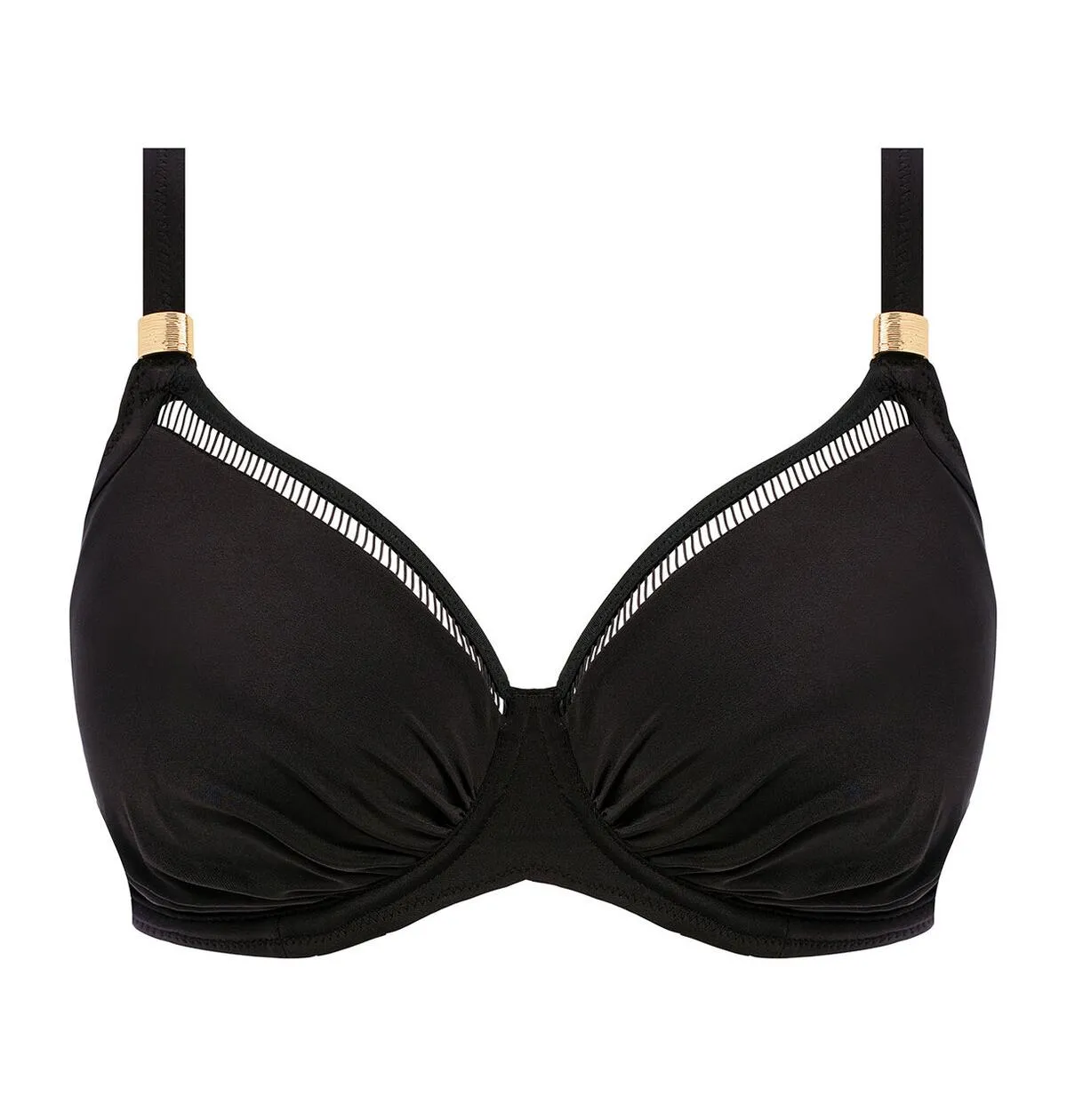 Верх купальника для большой груди Фэнтези Ист Хэмптон черного цвета - Fantasie East Hampton Full Cup Bikini Top FS502801 / 502801 blk. Сердцевидный вырез декольте. Изящная отделка-лесенка по краю декольте. Мягкая чашка с косточками. Красивая драпировка по нижнему краю чашки. Внутри - вшитые поддерживающие панели для большой груди. Чашка создает красивую естественную форму. Бретели с регулировкой длины. Основание бретелей украшены золотистой фурнитурой.