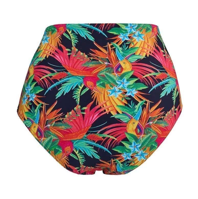 Высокие плавки Марлиз Дэккерс с тропическим принтом Гавайи в ретро-стиле - Marlies Dekkers Hula Haka 36134 rainforest and gold high waist briefs. Яркий разноцветный принт с тропическими птицами, листьями и цветами. Высокая линия талии скрывает и сглаживает рельеф живота. Ягодицы закрытые.