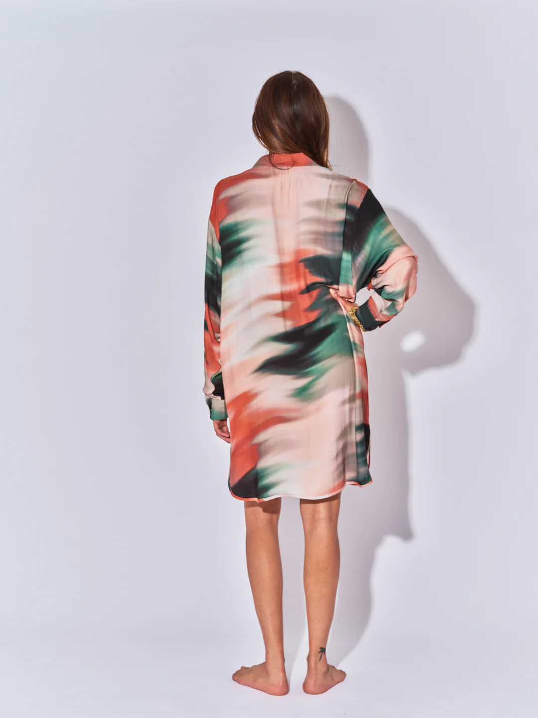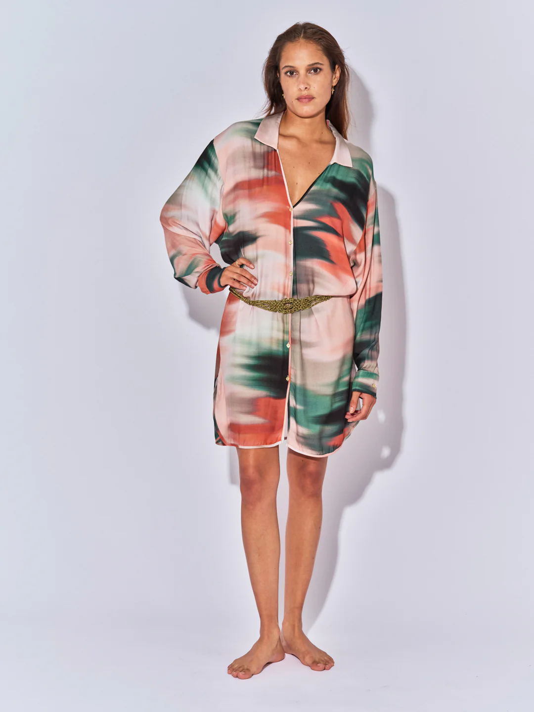 Длинная рубашка-туника Белиза Касси с разноцветным принтом тай-дай - Beliza Cassy CASSY TIE AND DIE V-NECK SHIR. Платье-рубашка выполнена из тонкого струящегося материала - 100% вискоза. V-образная горловина и застежка впереди на пуговицы. Длинные рукава, зауженные к запястьям, на манжете. Прямой крой, удлиненная спинка. По бокам неглубокие вырезы с закругленными краями.