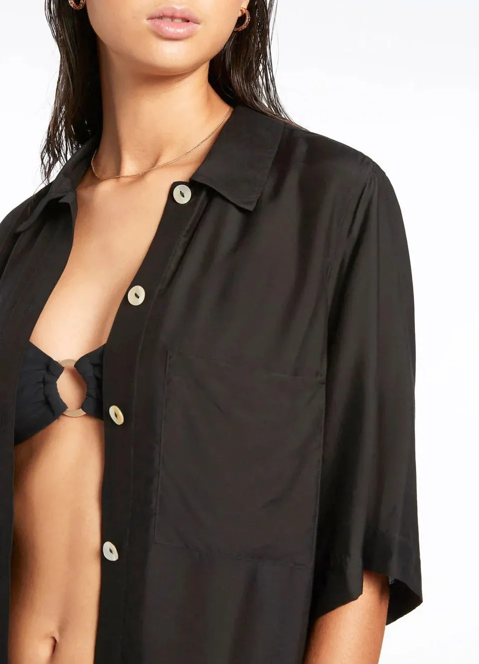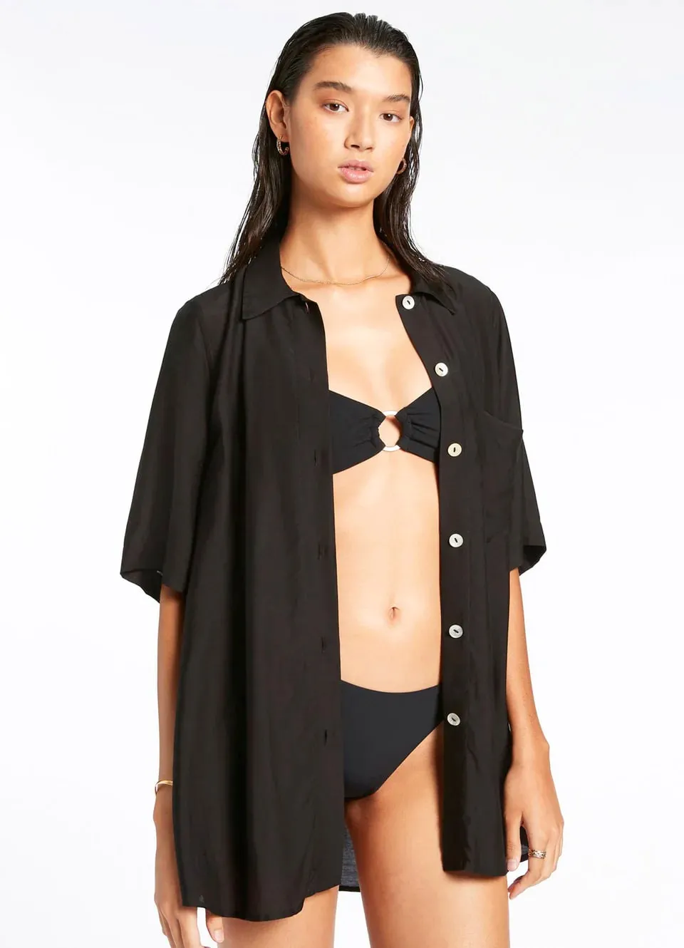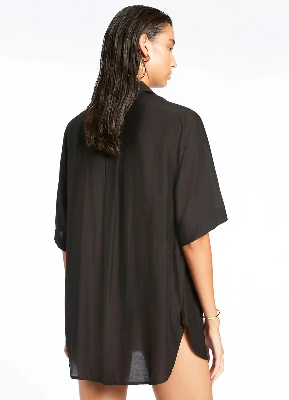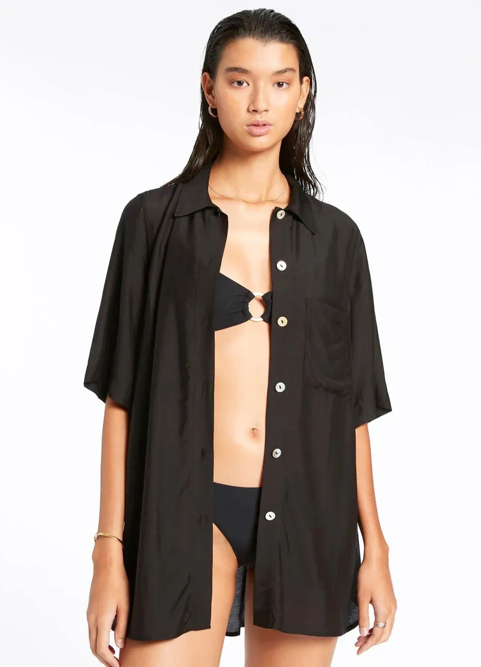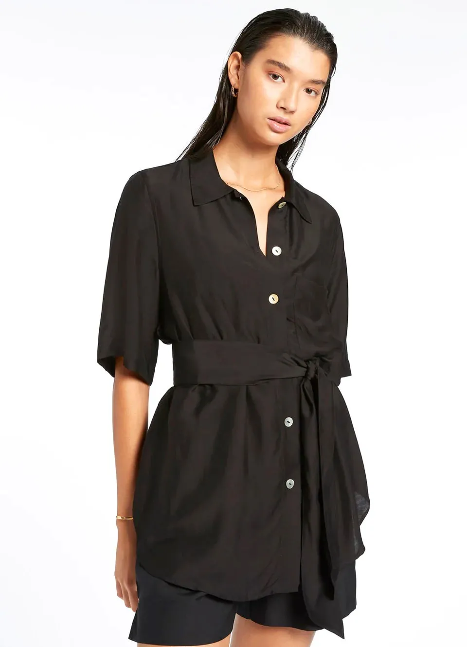 Рубашка с коротким рукавом Джетс Джетсет однотонная, чёрного цвета - Jetset Short Sleeve Shirt J61012 black. Выполнена из лёгкого струящегося материала - 84% вискоза, 16% натуральный шёлк, текстильное плотно. Классический рубашечный крой с треугольным воротником и застёжкой на пуговицы впереди. Короткие, широкие рукава. Впереди - накладной нагрудный карман. Чуть удлиненная рубашка до середины бедер, прямой крой. Изюминка модели - широкий пояс-лента в японском стиле (в комплекте).