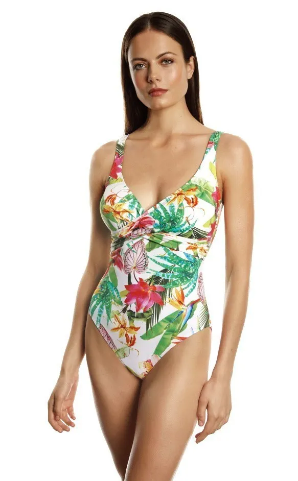 Испанский купальник Докор Парадиз с чашкой C, с ярким принтом тропические цветы - Docor Paradise 2410 C 141 Shape control. С защитой от ультрафиолета, фактор защиты: UPF 50+. Уплотненная чашка без косточек из тонкого полупоролона создает гладкий силуэт груди. Широкие бретели фиксированной длины. Открытая спина с глубоким, до талии, вырезом. Купальник с эффектом коррекции фигуры.