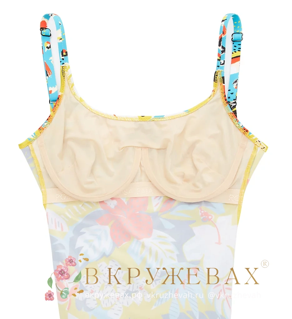 Полукруглое декольте, полукруглый, максимально открытый вырез спины. Бретели широко расставлены, с регулировкой длины, на металлической фурнитуре.