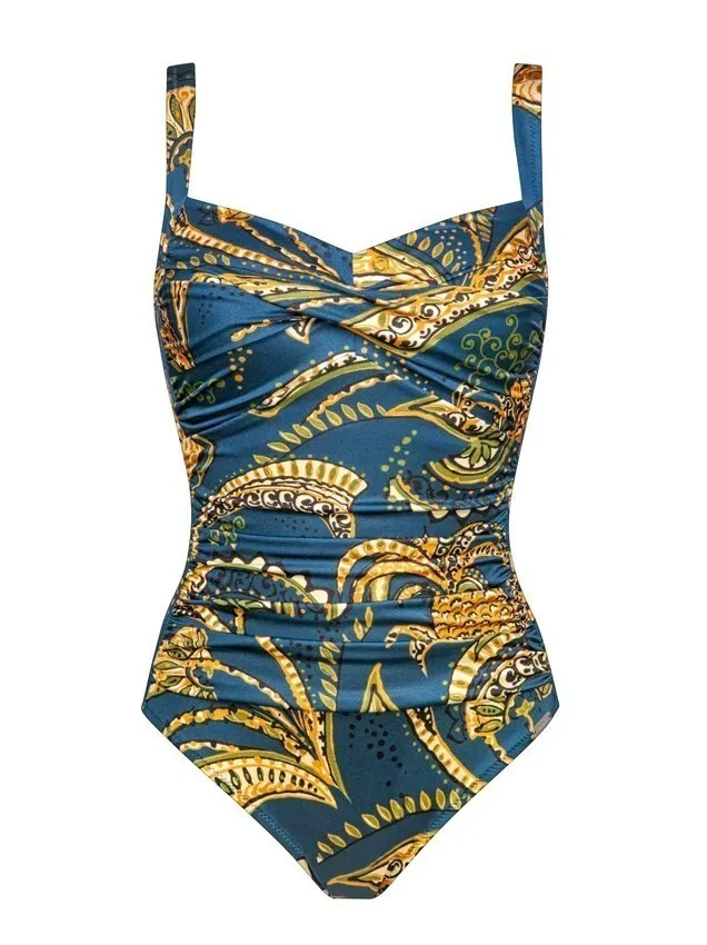 Слитный утягивающий купальник большого размера Шармлайн Сатин Фрутс с золотистым принтом на изумрудном фоне - Charmline Satin Fruits Wrap Front Swimsuit - Ocean Pineapple 1680543. Золотисто-жёлтый принт туники напоминает золотистые узоры книжных миниатюр и театральных декораций Л. Бакста. Благодаря эластичным свойствам ткани и функциональным драпировкам купальник красиво моделирует фигуру и делает силуэт стройнее.