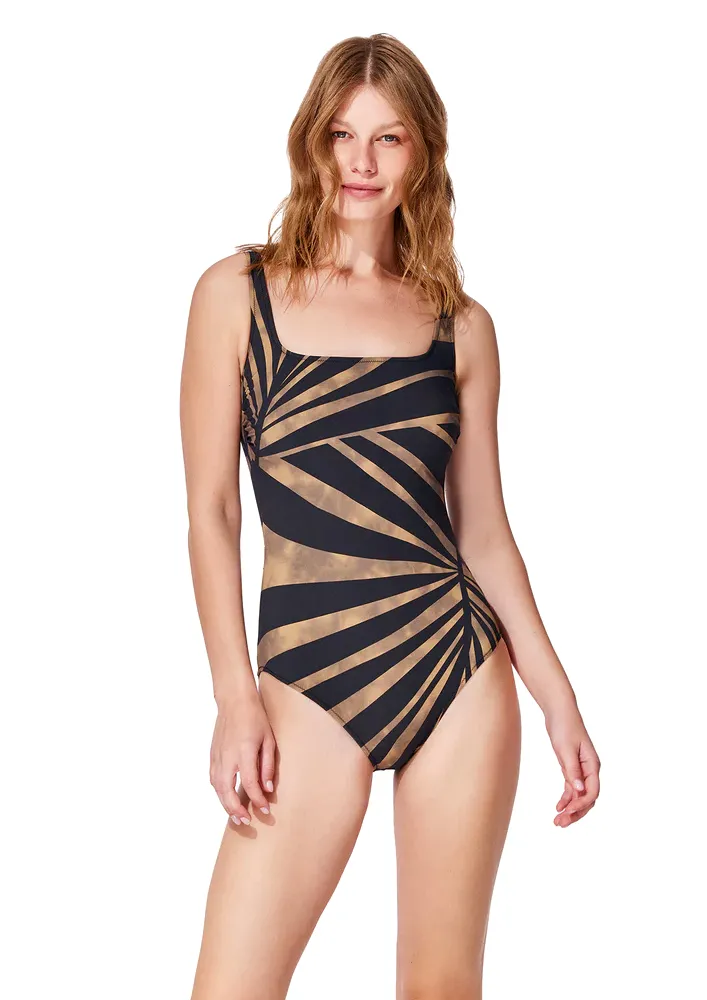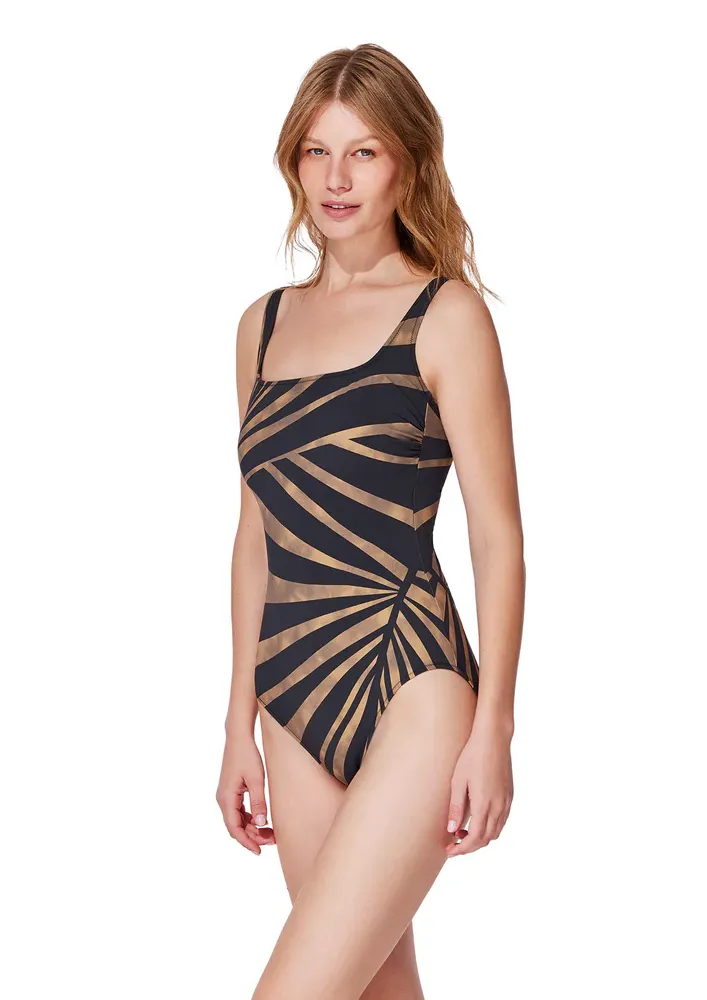 Закрытый корректирующий купальник Готтекс в чёрно-коричневую полоску тропических листьев - Gottex Desert Queen 26DQ173 011 Blk/Brwn