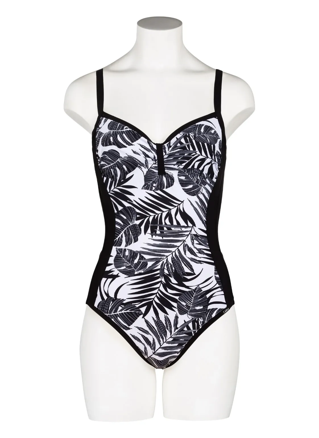 Слитный купальник Лидеа с растительным принтом Листья пальмы на белом фоне - Lidea 8653 975 Leaves. Выполнен из ткани с эффектной текстурой в мелкий рубчик. Бретели-спагетти, открытая спина с глубоким вырезом.