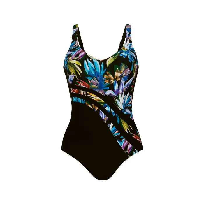 Слитный моделирующий купальник очень большого размера с ярким тропическим принтом на черном фоне - Anita LUELLA - Badeanzug M5-7377 815. Мягкая чашка на уплотненной подкладке, полностью непрозрачная с гладким рельефом. Полукруглое декольте, полукруглый вырез спины, открытый. Бретели с регулировкой длины.