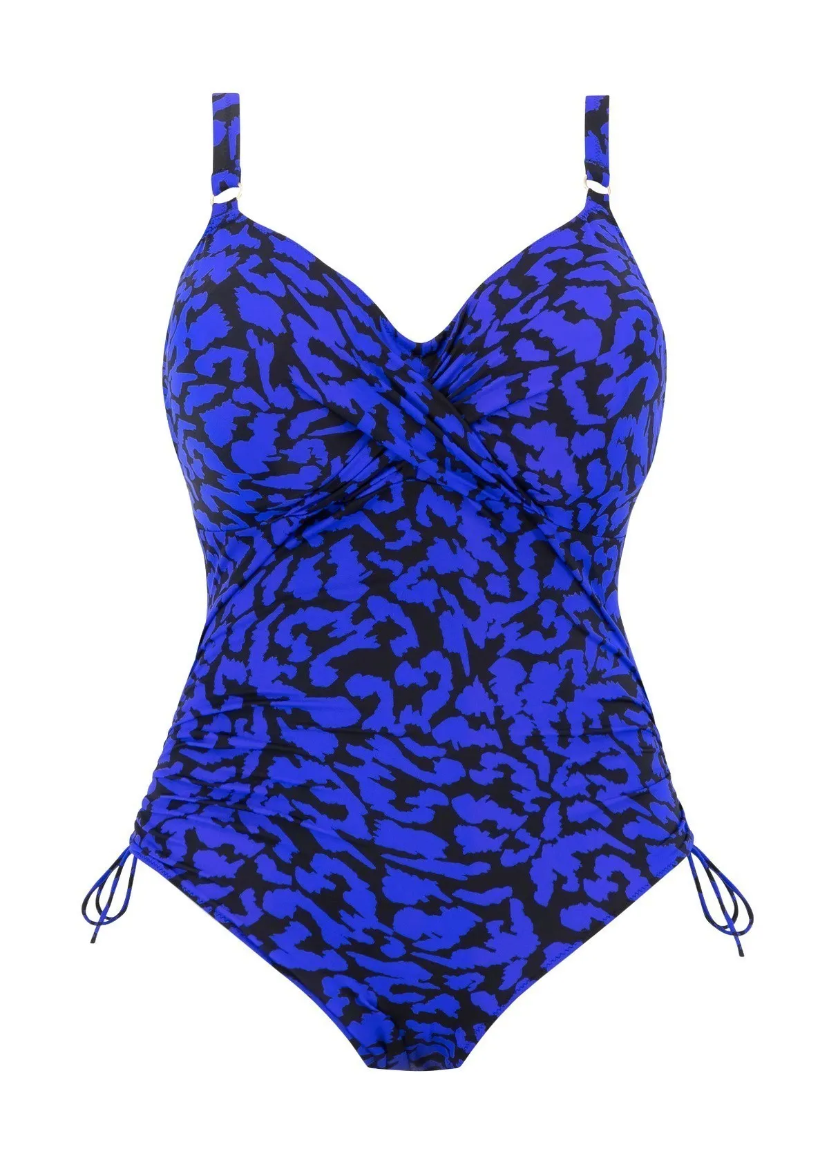 Слитный купальник с глубокой чашкой Фентези Хоуп Бэй фиолетово-черный - Fantasie Hope Bay Twist Front Swimsuit 504031 Ultramarine ULE. Глубокий вырез декольте планж plange. Мягкая чашка на скрытых косточках с красивой перекрещивающейся драпировкой. Косточки хорошо обхватывают и поддерживают грудь. Чашка двухслойная, внутренний слой из материала Powernet хорошо держит форму. Высокая перемычка между чашками. Бретели прикрепляются к топу серебристыми кольцами, с регулировкой длины. Необычный принт, напоминающий блики на воде и леопардовый принт.