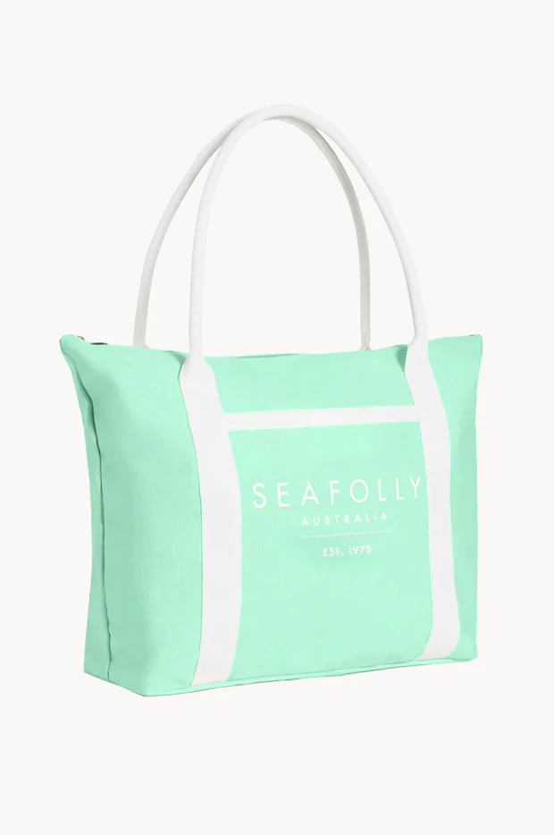 Пляжная сумка-тоут Сифолли светло-бирюзового цвета - Seafolly Canvas Tote Bag 72108-BG aquatic blue. 100% хлопок, текстильное полотно с текстурой холст. Прямоугольная форма, узкие ручки белого цвета. Двойные ручки достаточно длинные - сумку можно носить на плече. Застегивается на золотистую молнию. Впереди - внешний карман. Длина сумки - 52 см. Материал однослойный, без подкладки. Сумка украшена фирменной эмблемой Seafolly Australia