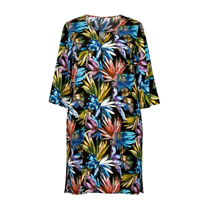 Платье-туника Анита Фестиваль агавы с ярким тропическим принтом на черном фоне - Anita SALLA Tunika 8617 M25 815 agave. Выполнено из лёгкого струящегося материала - 100% вискоза. Широкая полукруглая горловина с разрезом-капелькой. Прямой крой. Длина - выше колен. Рукава - 3/4. Удобные боковые карманы.