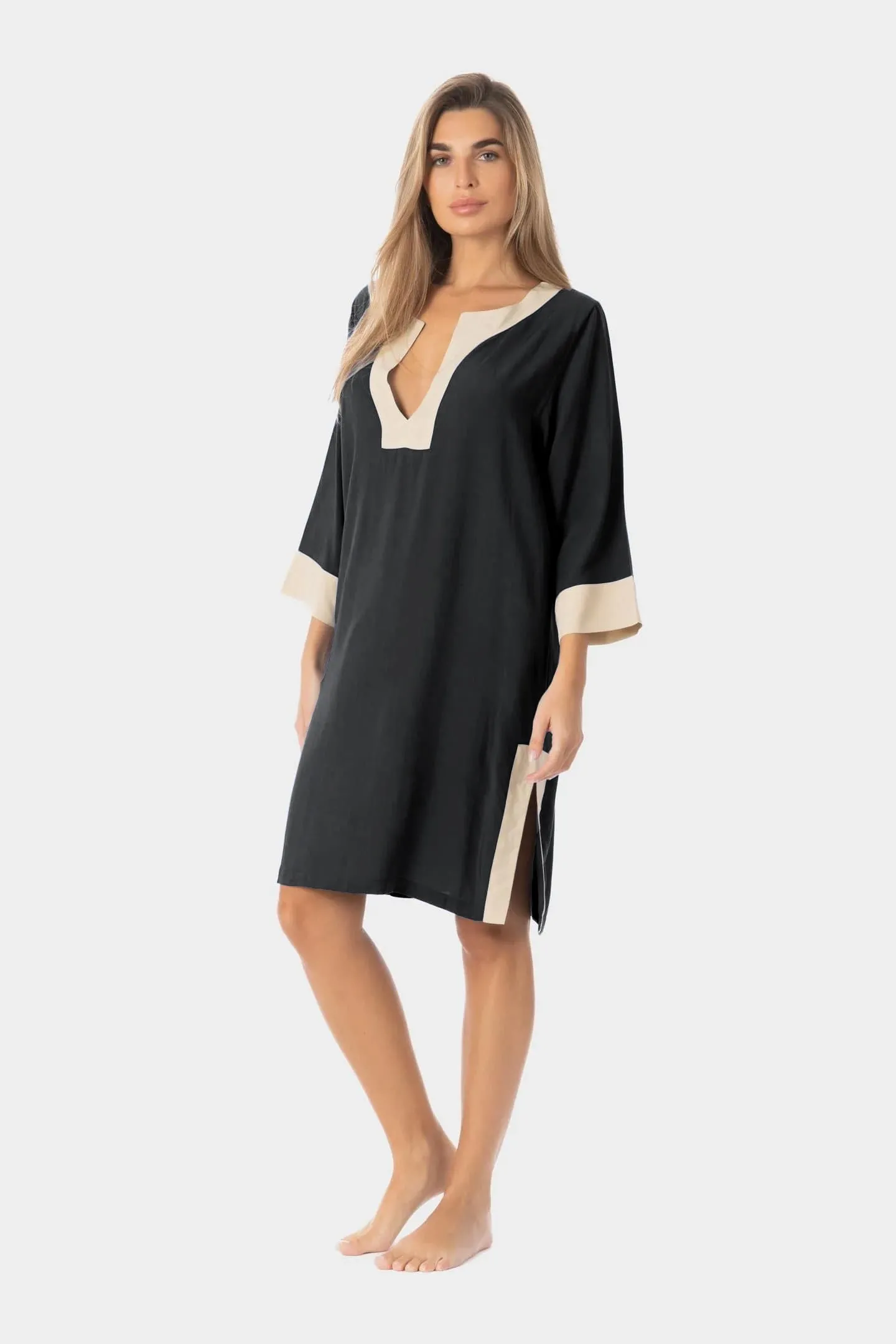 Короткое платье-туника Раджанти Оливия однотонное, чёрное с ванильной отделкой - Ragganti Olivia Edged Short Kaftan Cover-Up W2060 0239 NERO / SABBIA. Выполнена из легкого, струящегося материала - 100% вискоза, текстильное полотно. V-образная горловина с глубоким вырезом. Широкие рукава 3/4. Прямой свободный крой, длина - выше колен. По бокам - глубокие разрезы с контрастной окантовкой.