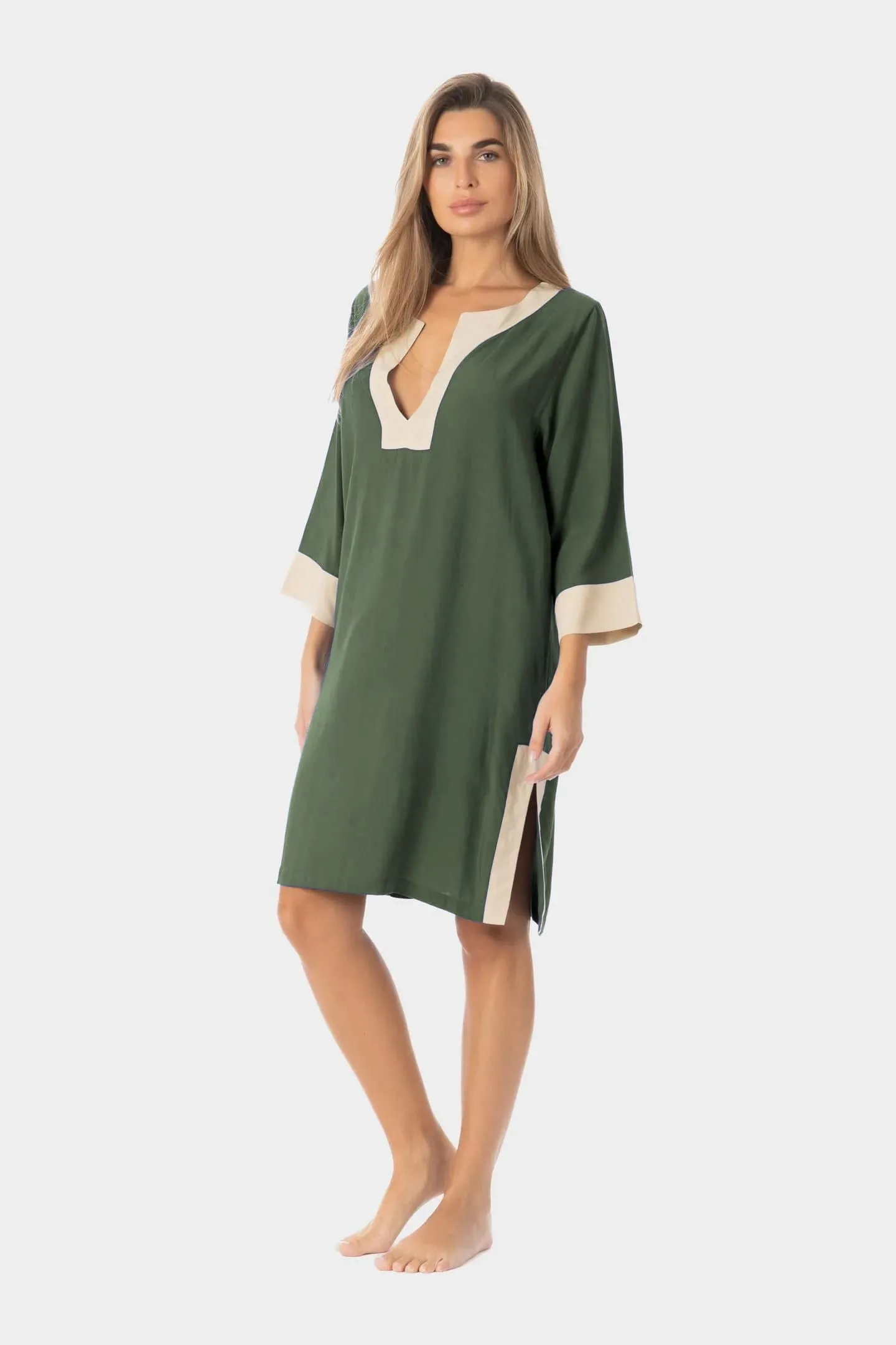Короткое платье-туника Раджанти Оливия однотонное, оливково-зелёное с ванильной отделкой - Ragganti Olivia Edged Short Kaftan Cover-Up W2060 4239 MILITARE / SABBIA. Выполнена из легкого, струящегося материала - 100% вискоза, текстильное полотно. V-образная горловина с глубоким вырезом. Широкие рукава 3/4. Прямой свободный крой, длина - выше колен. По бокам - глубокие разрезы с контрастной окантовкой.