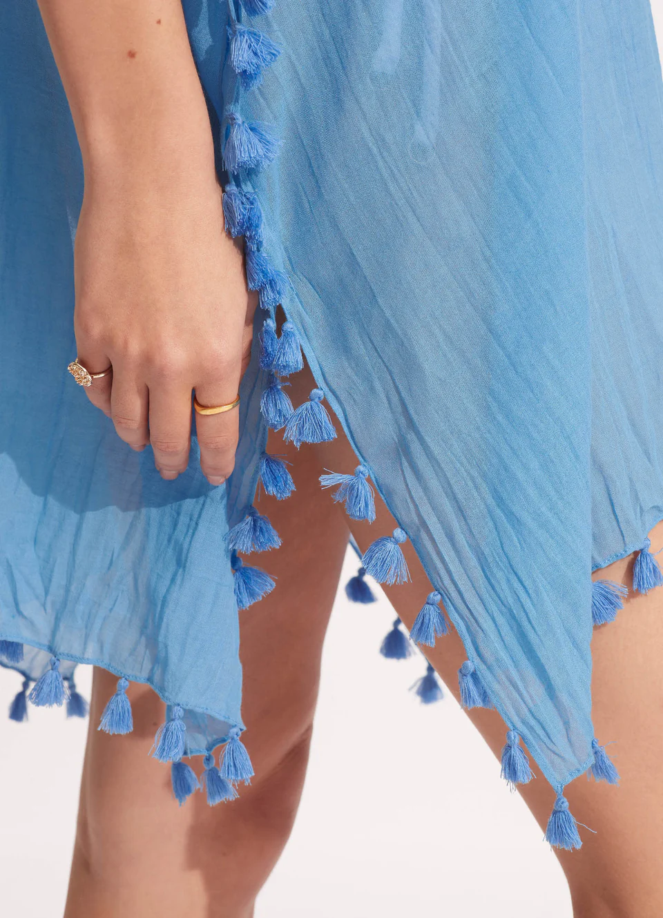 Короткий кафтан-туника Сифолли Амнезия голубого цвета Ажур - Seafolly Amnesia Kaftan 52162 Azure. 100% хлопок, жатая фактура ткани. V-образная горловина с декоративными кисточками по краю всего изделия. Короткий рукав. Универсальный размер.