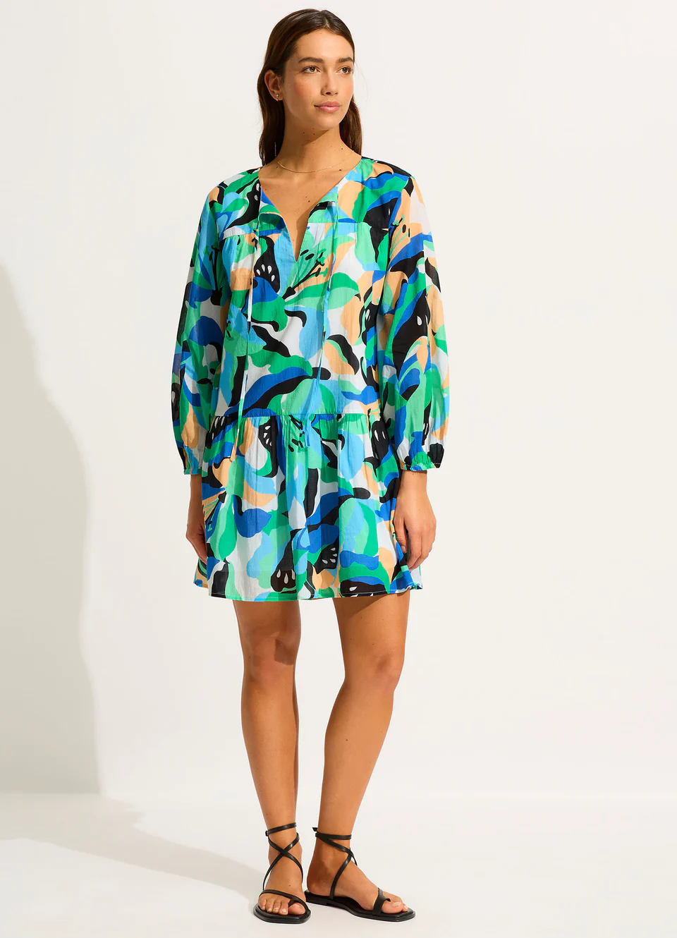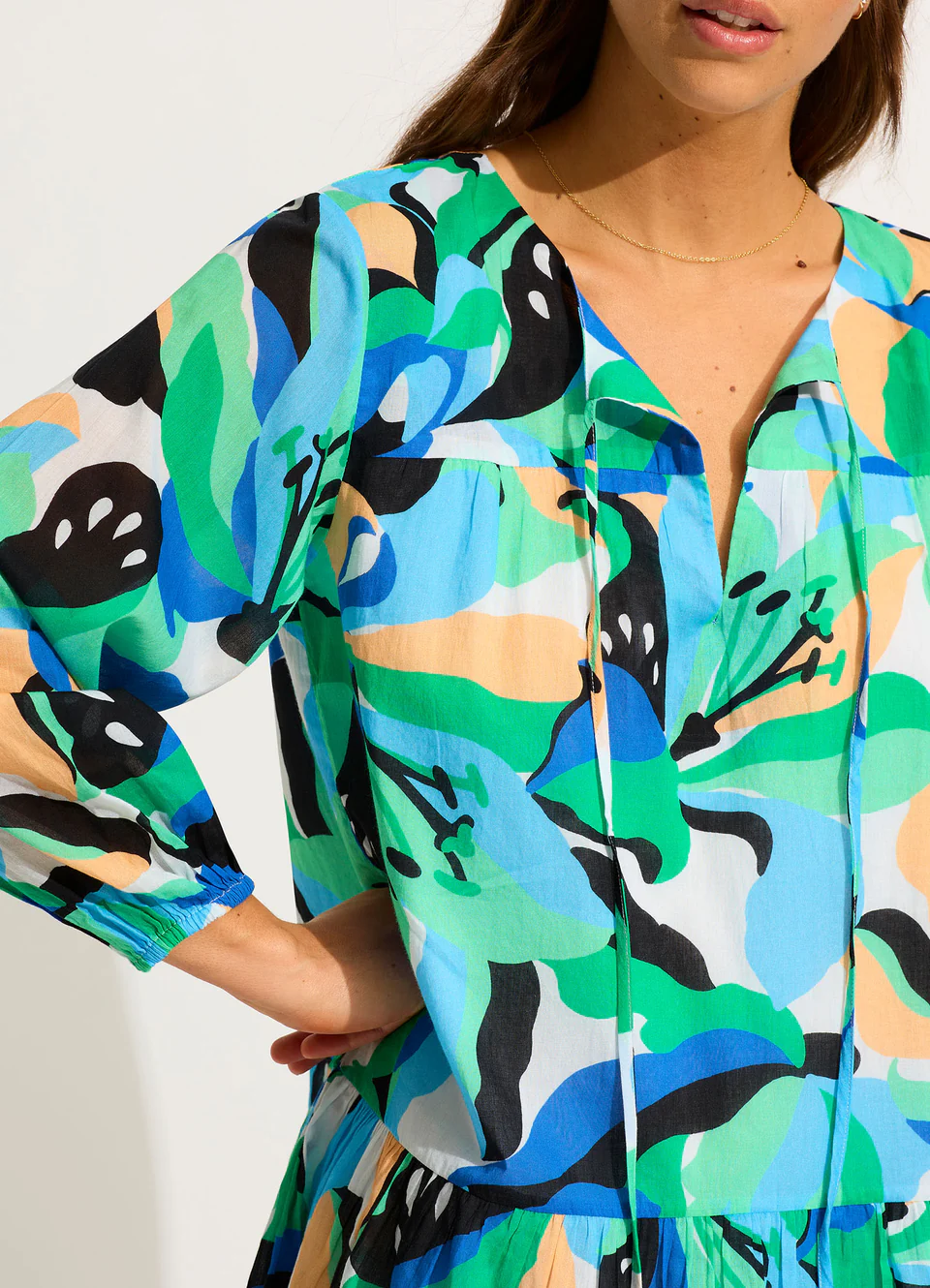 Хлопковое платье-туника с воланами Сифолли Рио крупными цветами в сине-зеленых оттенках - Seafolly Rio Cover Up - Jade 55270-CU. 100% хлопок, текстильное полотно. Тонкая, лёгкая, дышащая ткань. Длина - до колена. Широкий крой со сборкой. Длинные рукава со сборкой на узкую манжету. V-образная горловина, завязывающаяся на шнурочки.