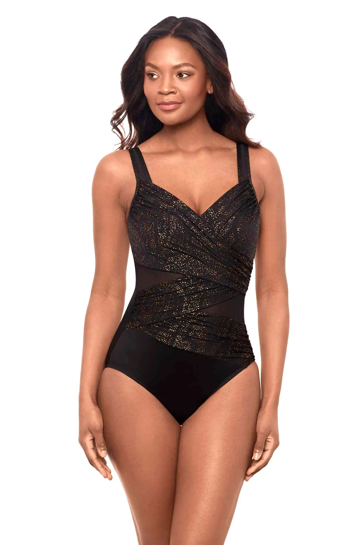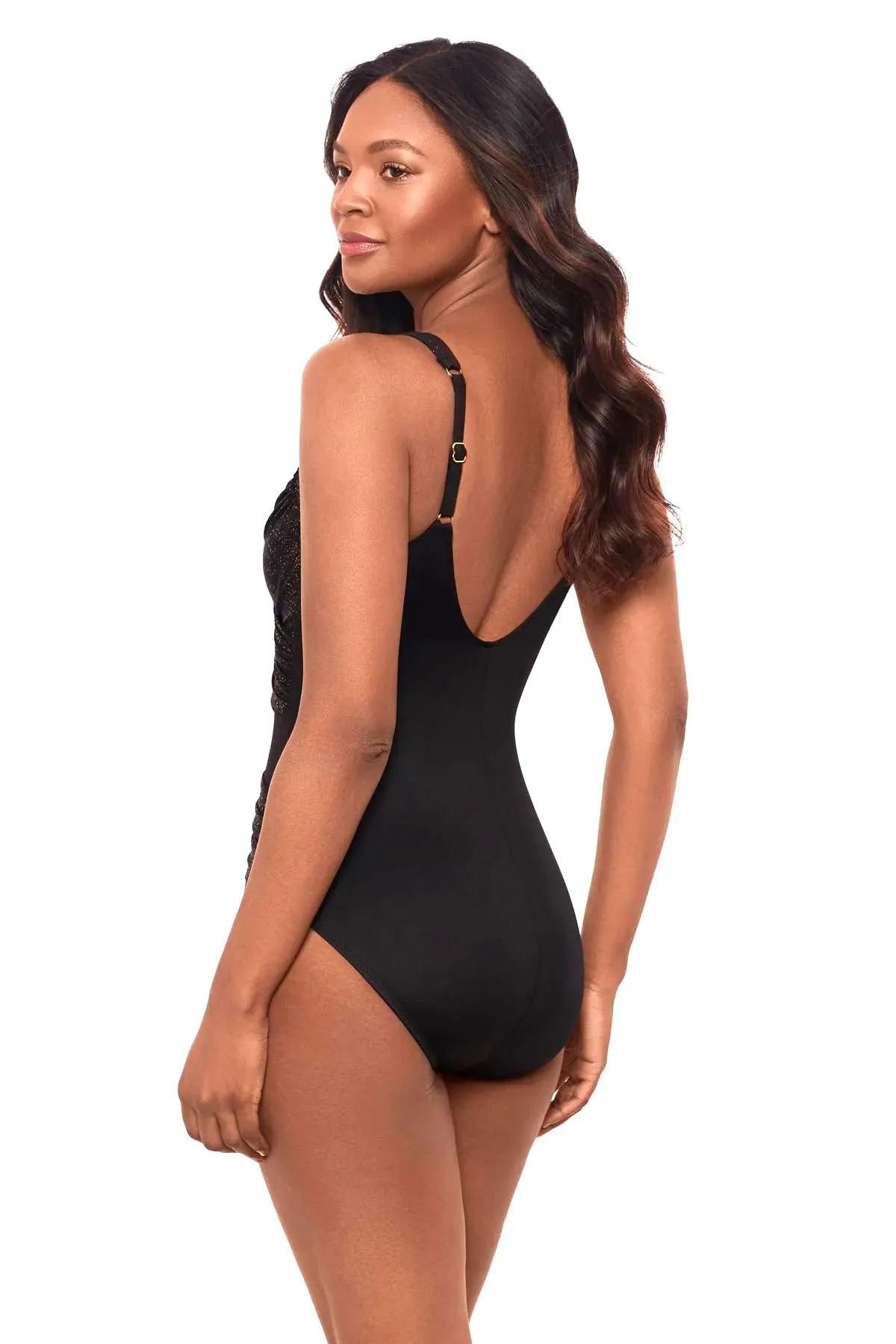 Утягивающий купальник Мираклсьют, модель Мадеро чёрного цвета с золотистым принтом - Miraclesuit MADERO One Piece in Brillante 6566365 BLK. С эффектными полупрозрачными сетчатыми вставками и асимметричными драпировками, создающими моделирующий эффект.