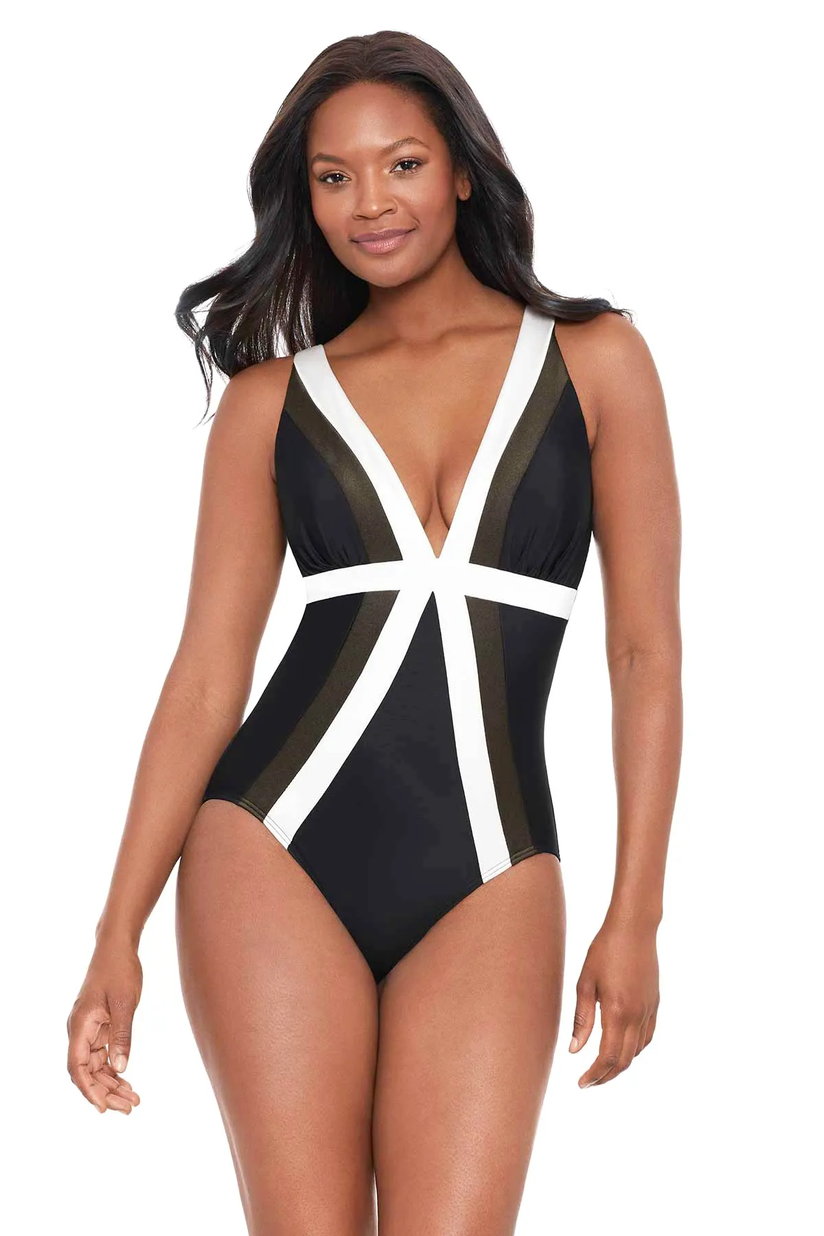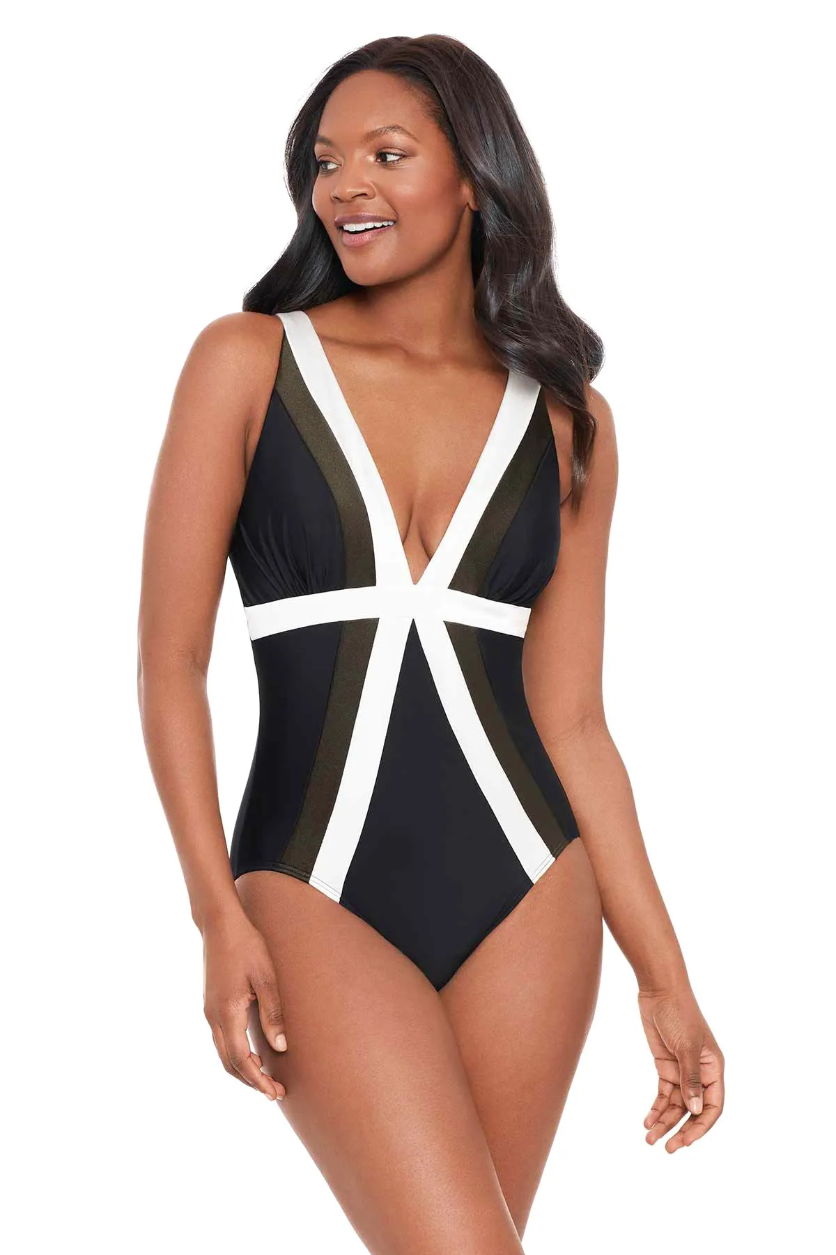 Слитный утягивающий купальник Мираклсьют Трилогия спектра черного цвета с оливковыми и белыми полосами - Miraclesuit Spectra Trilogy 6554352 BLK. Расположение белых полос красиво акцентирует фигуру, визуально подчеркивает стройность. Линия талии оптически завышена - фигура кажется более статной и высокой, а ширина скрывается темными вставками.