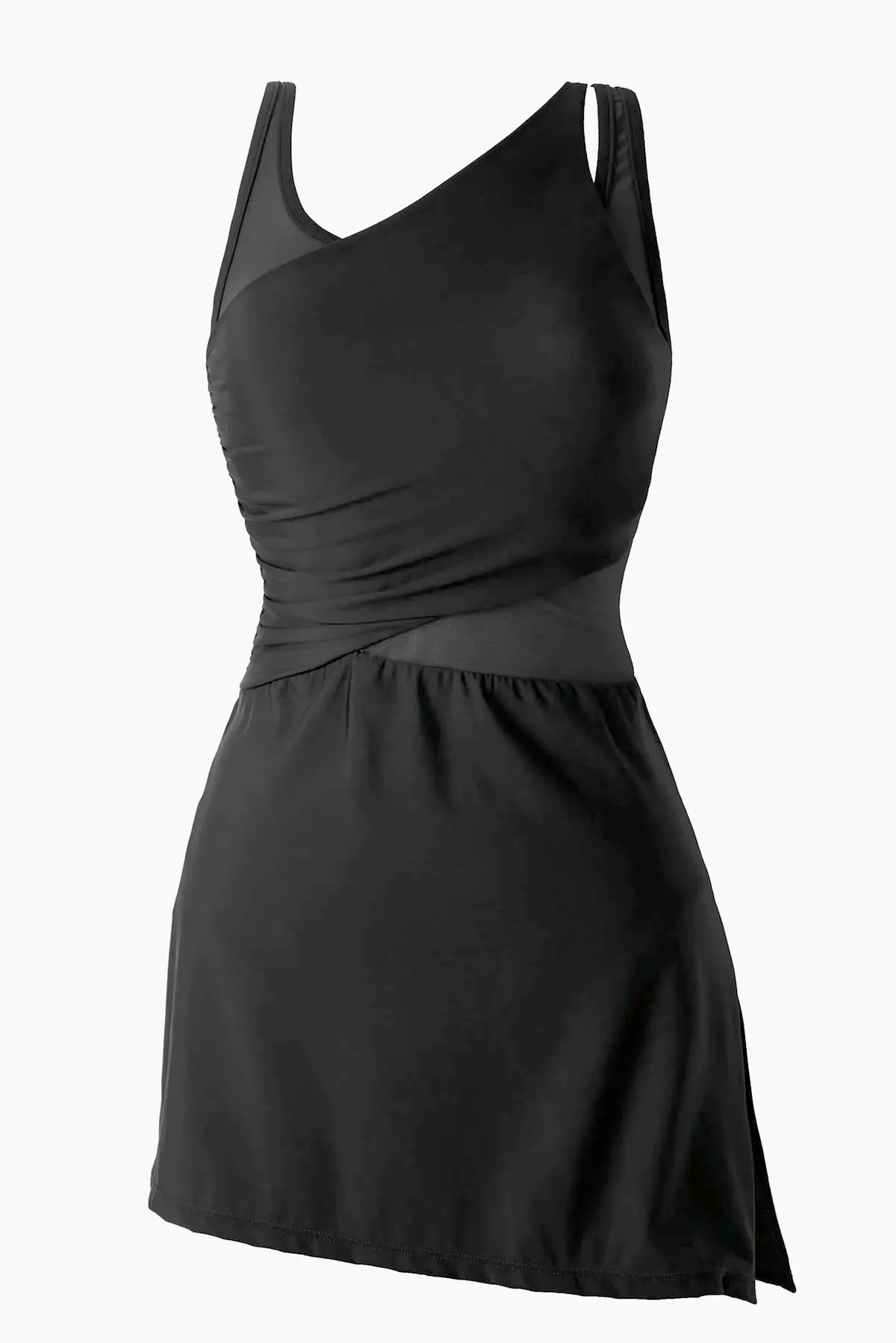 Утягивающий купальник - платье c юбкой Мираклсьют Алина однотонно черного цвета с сетчатыми вставками - Miraclesuit Alina Swim Dress 6553234 BLK. Драпировка и текстура ткани создают моделирующий эффект. Эффектное асимметричное декольте с V-образным вырезом и двуслойной фактурой. Необычное сочетание полупрозрачной сеточки и основного непрозрачного материала. Короткая юбочка с глубоким вырезом и асимметричным краем скрывает ягодицы и бедра.