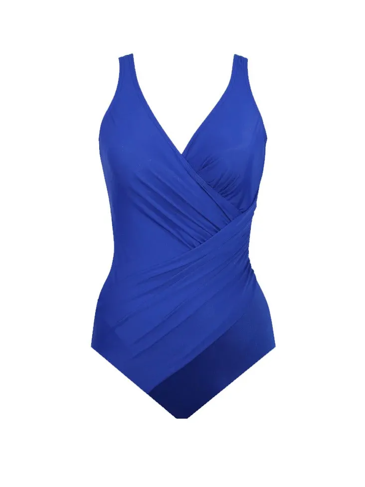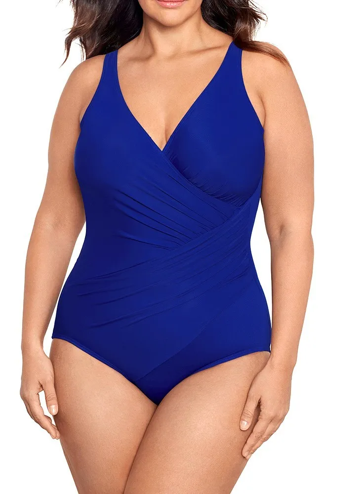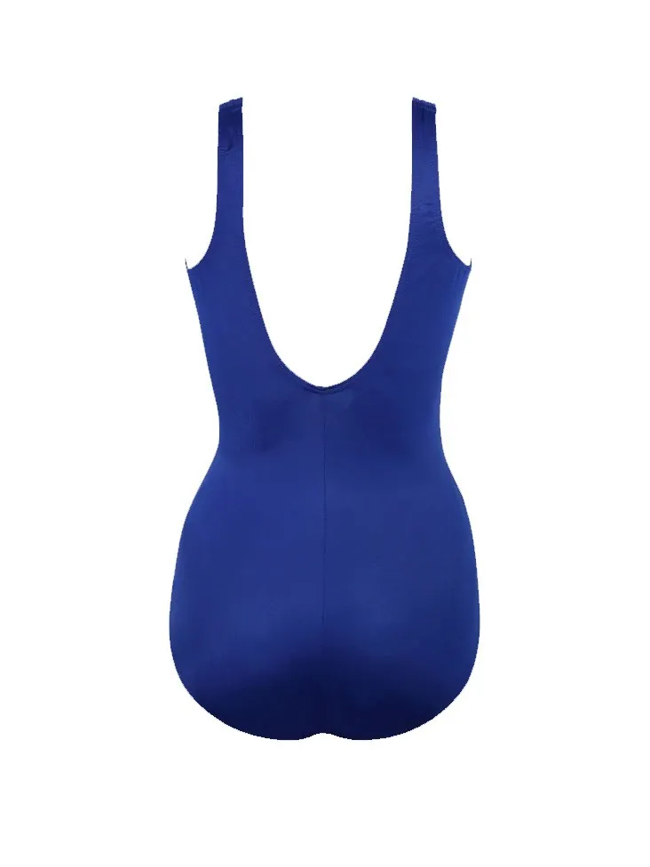Моделирующий слитный купальник большого размера Мираклсьют Солидз Океанус однотонный, ярко-синего цвета - Miraclesuit Solids 6519088W AZL - модель Oceanus. Гладкая, уплотненная чашка с тонким полупоролоном, бретели фиксированной длины, V-образная горловина, высокая, закрытая спинка. Благодаря асимметричному крою и перекрещивающимся драпировкам купальник создает утягивающий эффект и формирует красивый силуэт.