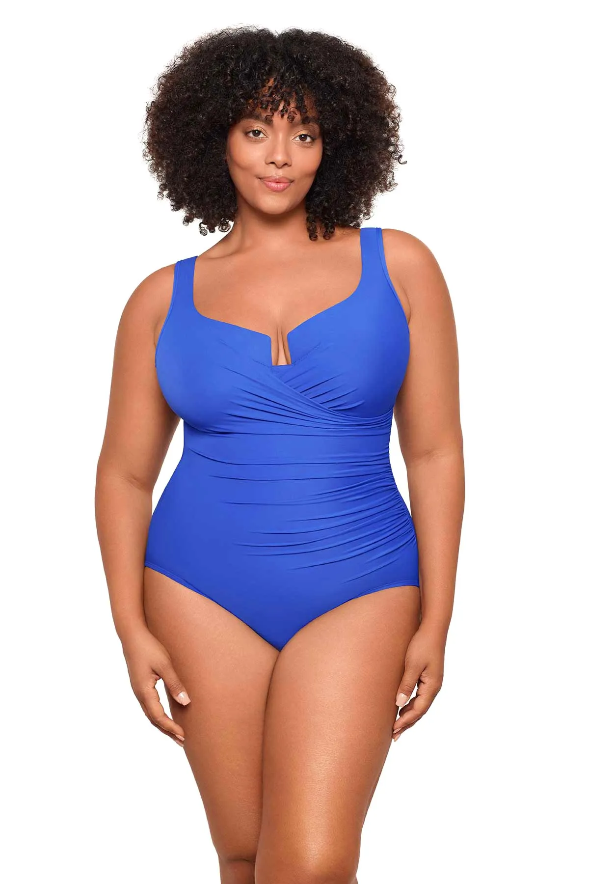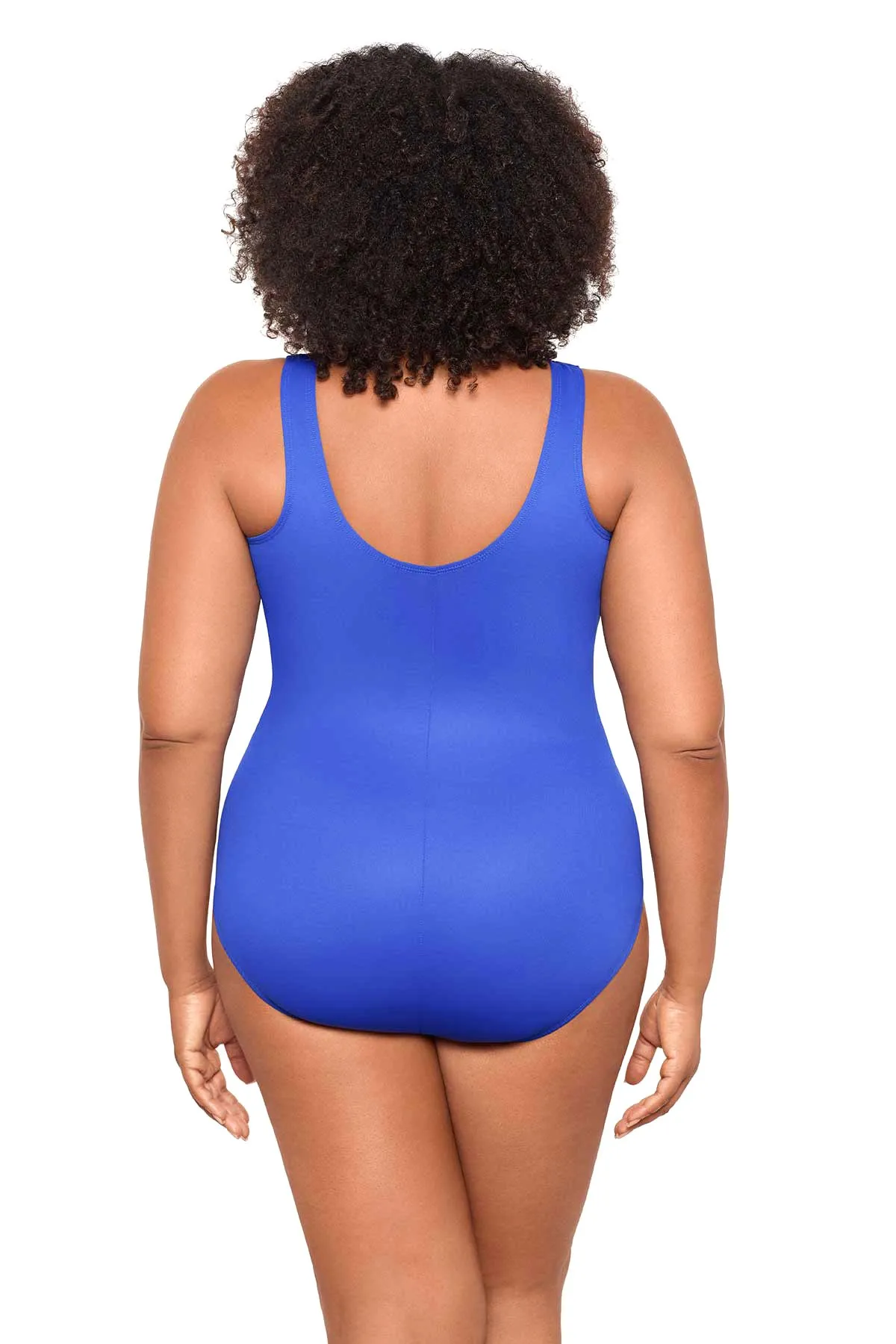 Утягивающий купальник большого размера Мираклсьют Солидз, модель Эскейп ярко-синего цвета дельфин - Miraclesuit Solids Escape 6518966 W DPN Delphine. Модель для большого размера, специальная маркировкаW. Специальная конструкция и особенности материала обеспечивают утяжку талии и бедер, контроль линии живота.