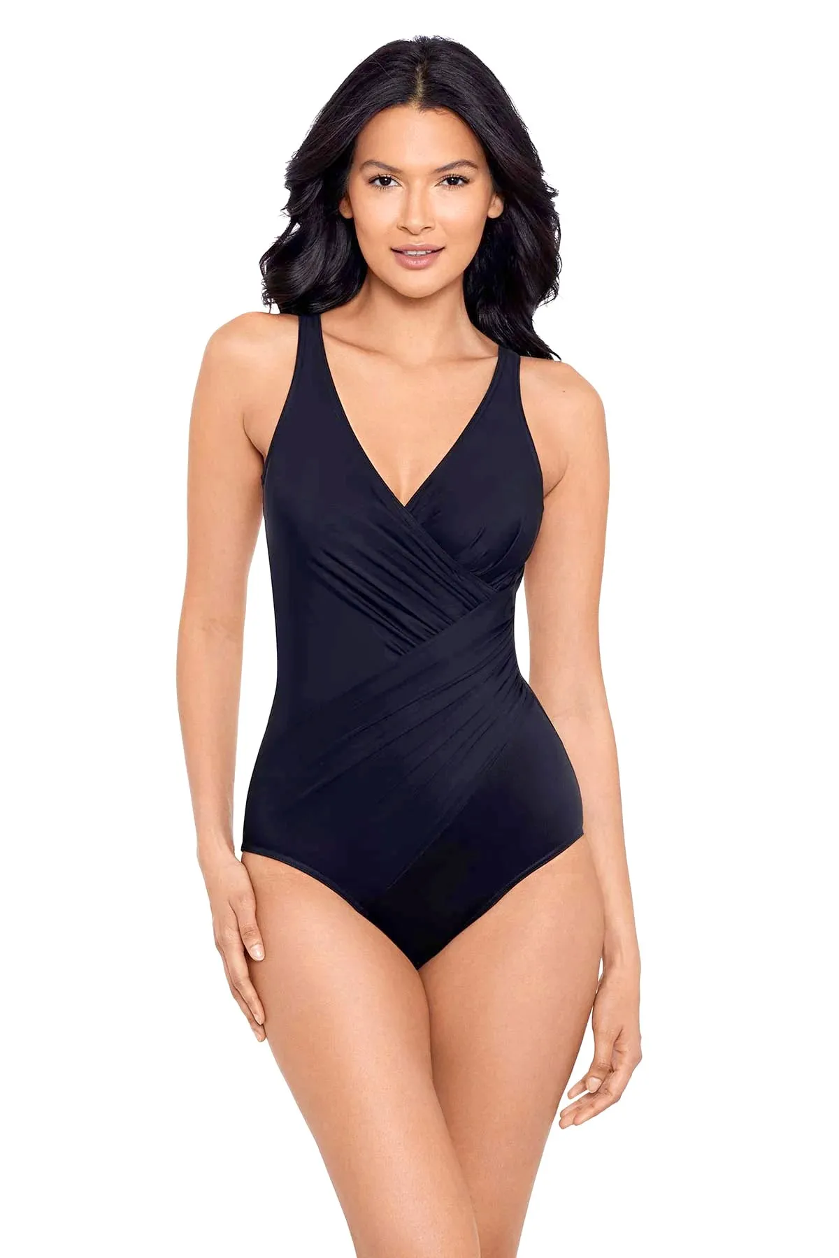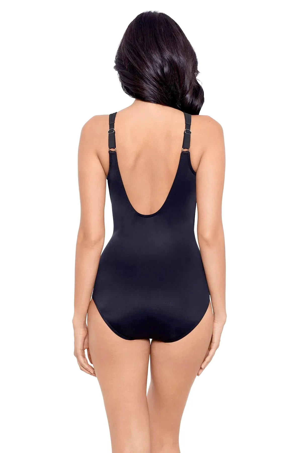 Моделирующий слитный купальник Мираклсьют Океанус DD для большой груди, однотонный, чёрного цвета - Miraclesuit 6516388 DD BLK - модель Oceanus. Гладкая, мягкая чашка на косточках, с тонким поддерживающим слоем. Бретели с регулировкой длины. V-образная горловина.