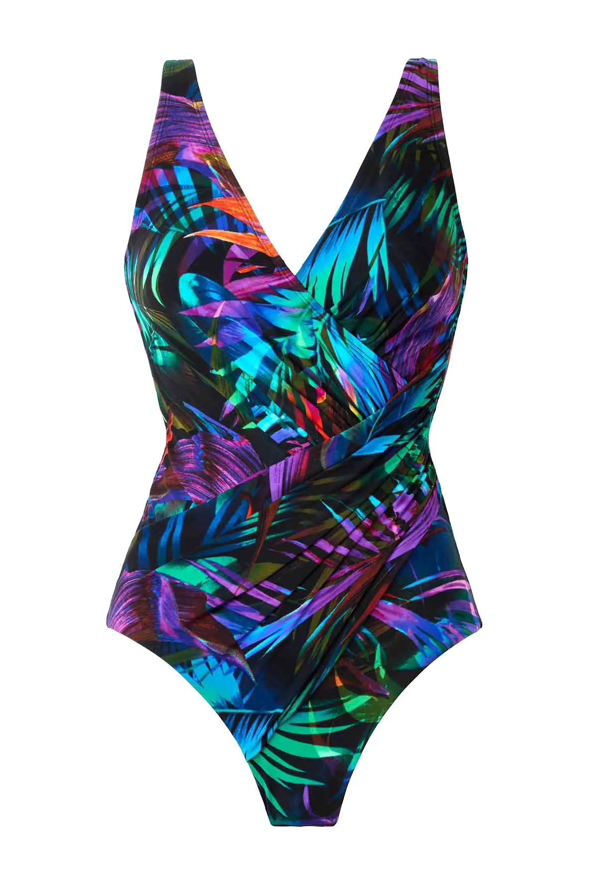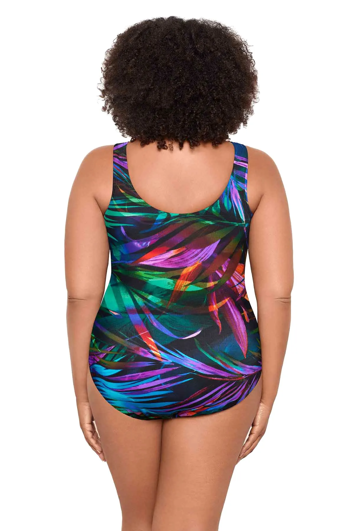 Моделирующий слитный купальник большого размера Мираклсьют Океанус с ярким тропическим принтом в зелено-фиолетовых тонах - Miraclesuit Oceanus One Piece in Palma Paradiso 65660488W MLT multi. Модель Oceanus. Гладкая мягкая чашка без косточек. Широкие бретели фиксированной длины, V-образная горловина, наполовину закрытая спинка. Благодаря асимметричному крою и перекрещивающимся драпировкам купальник создает утягивающий эффект и формирует красивый силуэт.