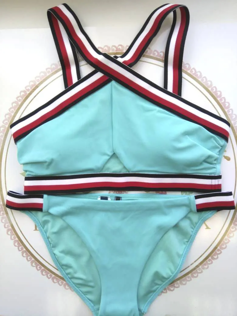 Ярко-голубой топ купальника с перекрещивающимися бретелями и широкой спинкой Томми Хилфигер. Бретели - в традиционных цветах бренда.