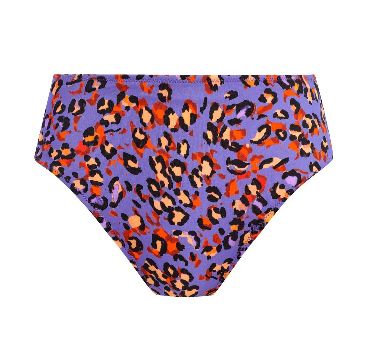 Классические плавки Фрея Ночи Сантьяго с леопардовым принтом на фиолетовом фоне - Freya Santiago Nights High Waist Bikini Brief 205678. Завышенная линия талии сглаживает рельеф живота. Края изделия обработаны эластичным швом. Ягодицы закрыты.