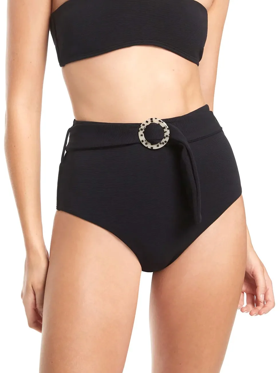 Высокие чёрные плавки Джетс Исла Риб - Jets Isla Rib Belted High Waisted Bikini Bottom J 3983. Высокая линия талии сглаживает рельеф живота и бедер. Выполнены из эффектной текстурированной ткани, на подкладе. Широкий пояс с декоративным ремешком, украшен застежкой-кольцом, позволяет регулировать объем талии.