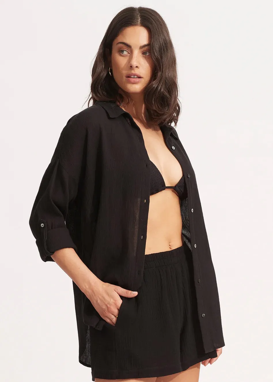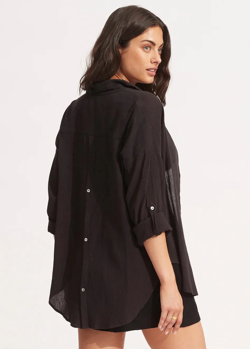 Хлопковая рубашка из текстурного материала Сифолли черного цвета - Seafolly Beach Shirt 54027-TO black. 100% хлопок, жатая текстура. Застежка на пуговицы из перламутра. Длинные рукава на манжетах, застегиваются ремешком для укорачивания. Сзади - эффектный разрез на пуговицах.