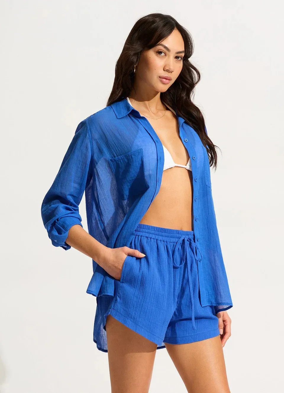 Хлопковая рубашка из текстурного материала Сифолли Бриз ярко-синего цвета ажур - Seafolly Breeze Beach Shirt 54795-TO - azure. 100% хлопок, жатая текстура, жатка. Оверсайз крой. Классический треугольный воротник-стоечка. Кокетка на спине, внизу - полукруглые разрезы. Застежка на пуговицы. Длинные рукава на манжетах, застегиваются ремешком для укорачивания. Большой накладной карман.