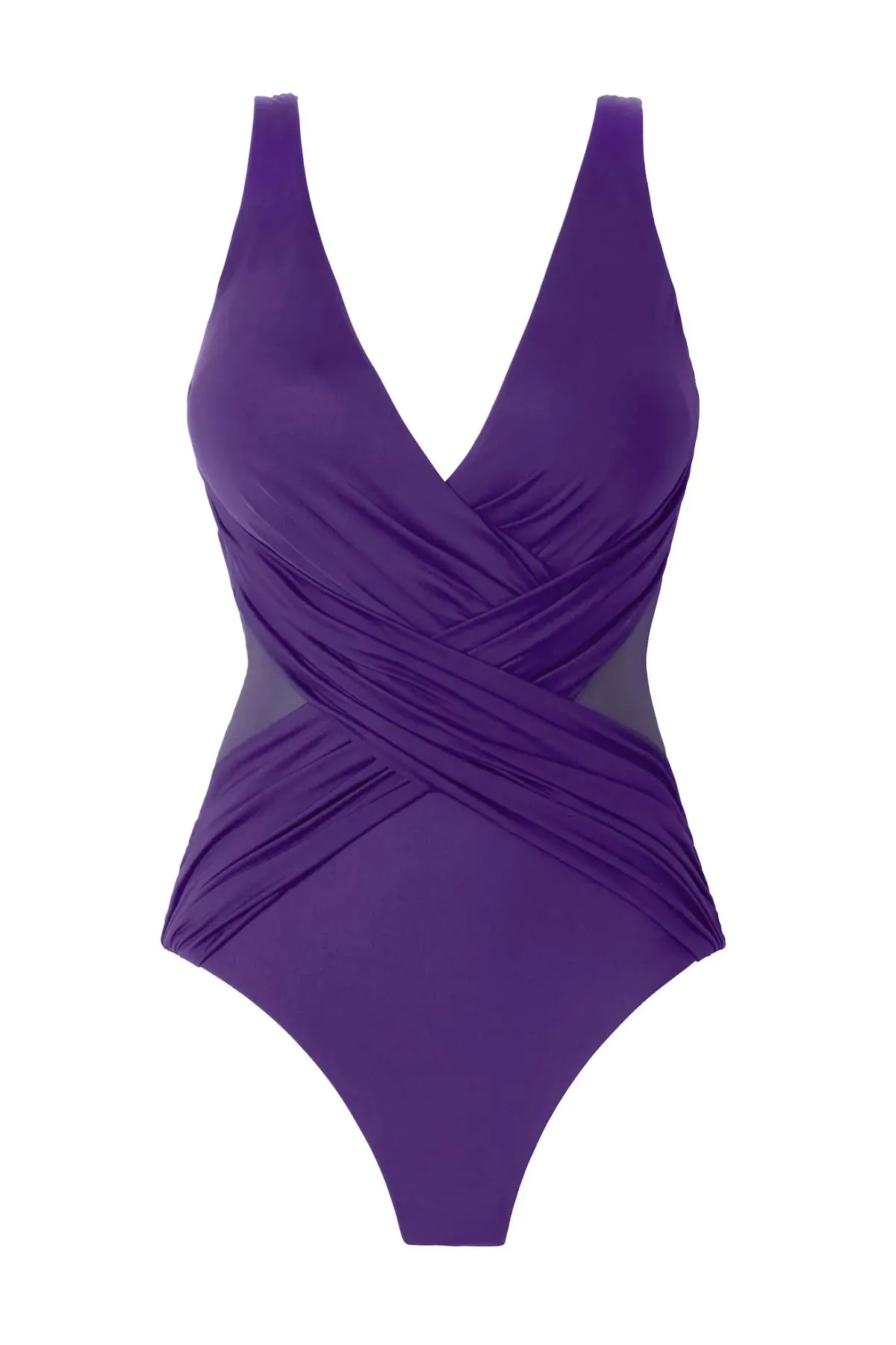 Утягивающий купальник Мираклсьют, модель Кроссовер ярко-фиолетового цвета - Miraclesuit Crossover With Mesh One Piece Swimsuit 6516689 MBY Mulberry. С эффектными полупрозрачными сетчатыми вставками и перекрещивающимися драпировками, создающими моделирующий эффект. Уплотненная драпировка утягивает выступающий животик и сглаживает бока.