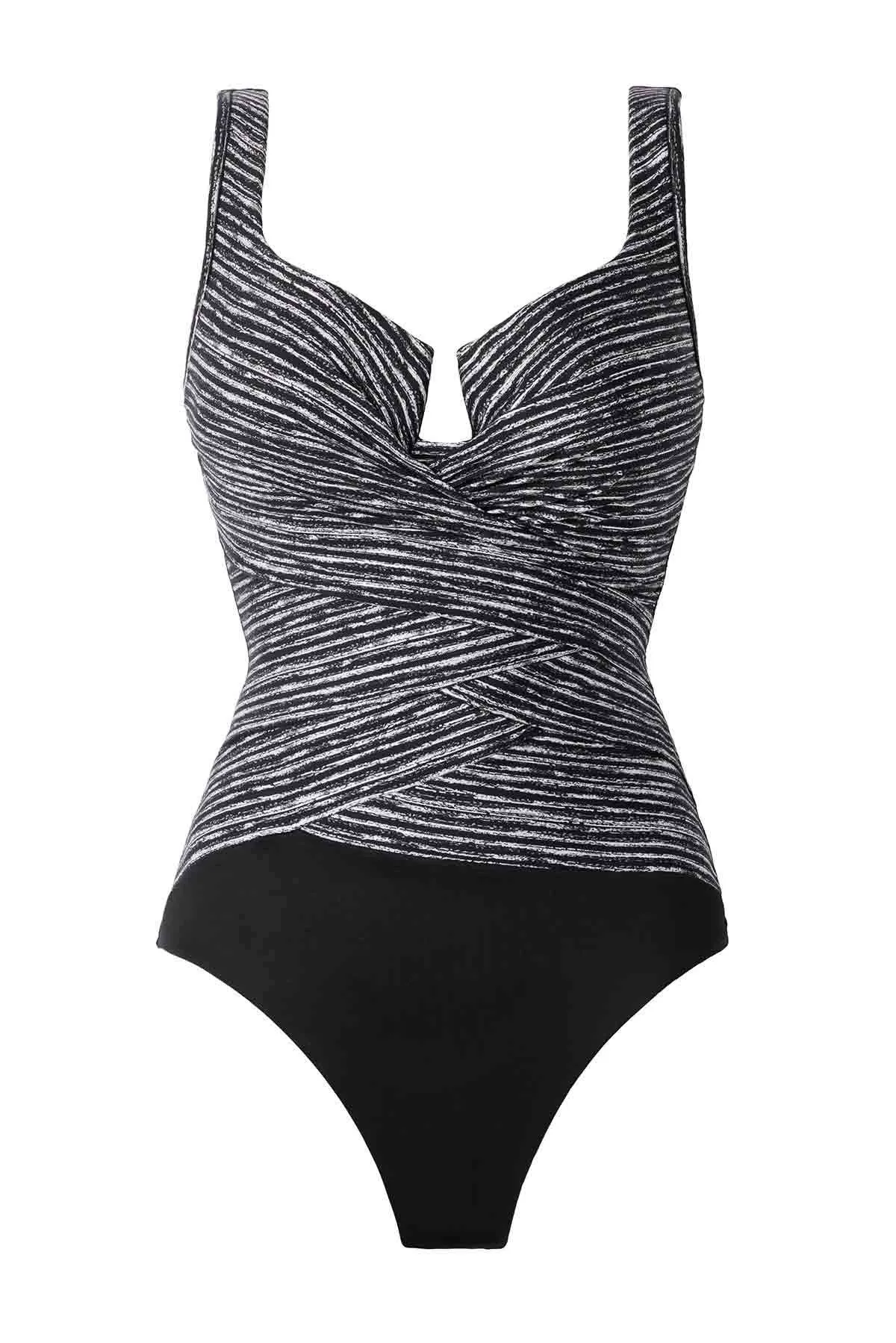 Красиво моделирует фигуру, эффектная асимметричная драпировка крест-накрест сглаживает рельеф живота и подчеркивает грудь. Уплотненная, формованная чашка на косточках. Бретели широкие, фиксированной длины. Красивый сердцевидный вырез декольте.