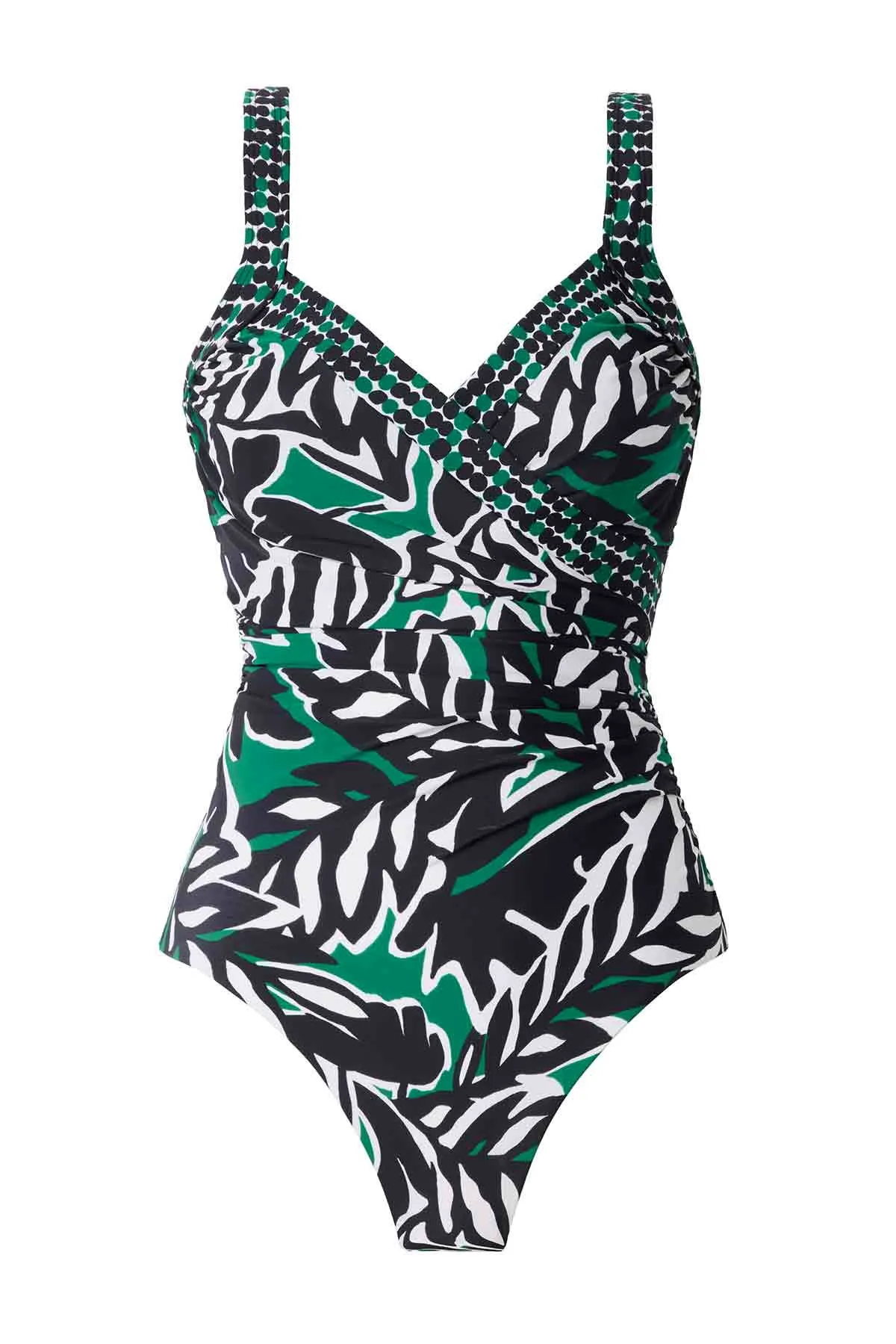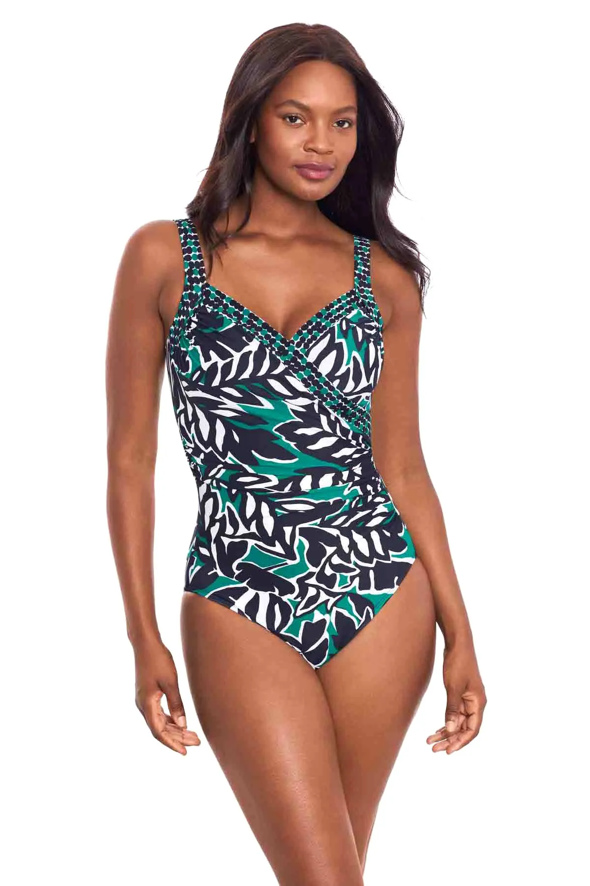 Слитный утягивающий купальник Мираклсьют, модель Санибель с принтом листья в оттенках изумрудного, белого и чёрного - Miraclesuit Sanibel Palma Verde 6552263 BLM. Мягкая чашка на косточках.