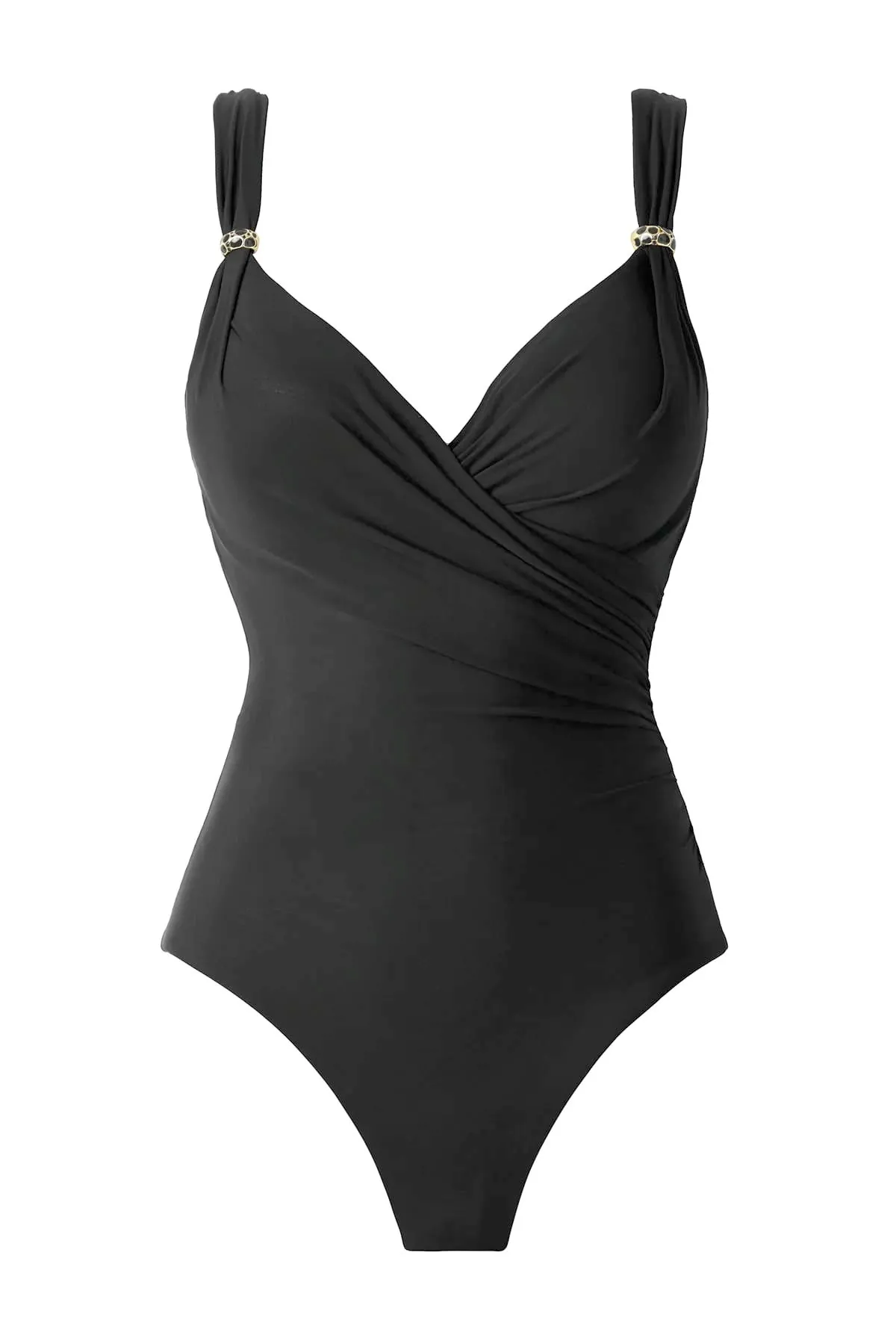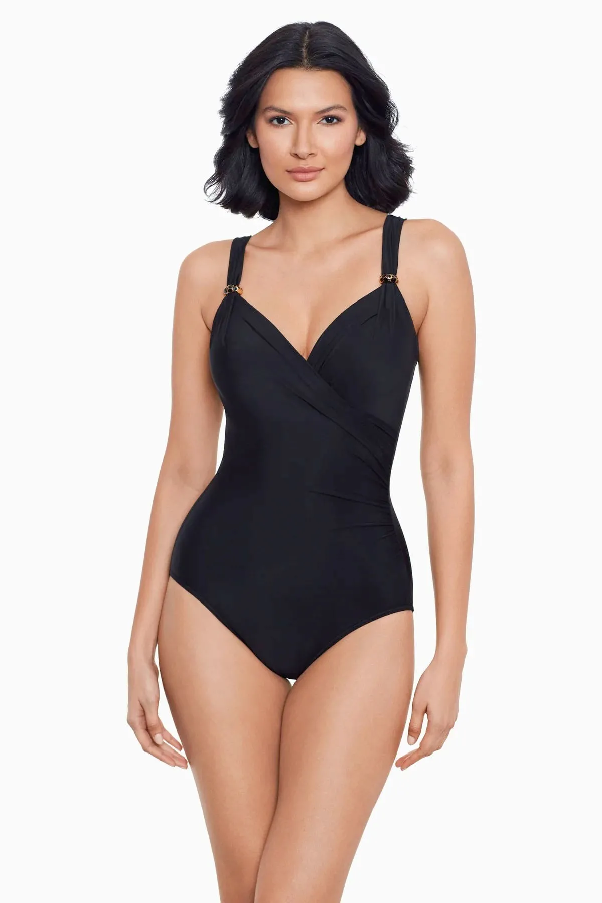 Утягивающий купальник для большой груди Мираклсьют Сирен однотонно-чёрного цвета - Miraclesuit Siren One Piece 6566417 DD BLK. Модель Siren. Асимметричный крой с драпировками и особенности материала обеспечивают утяжку талии и бедер, контроль линии живота.