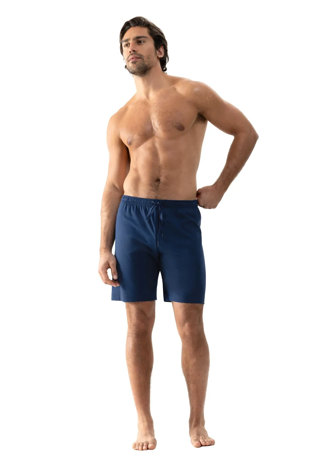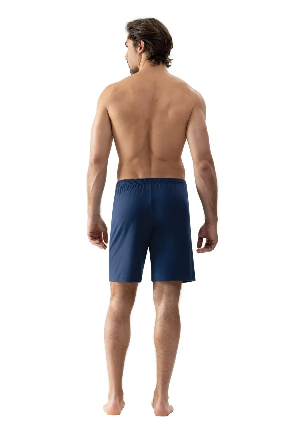 Мужские трикотажные шорты из хлопка Мэй Мэлтон тёмно-синего цвета - Mey Melton Shorts 20750 668. Лёгкая дышащая ткань, хорошо пропускает воздух. 100% хлопок. На широком поясе-резинке с регулировкой объема шнурком. Без карманов. Длина - до колена.
