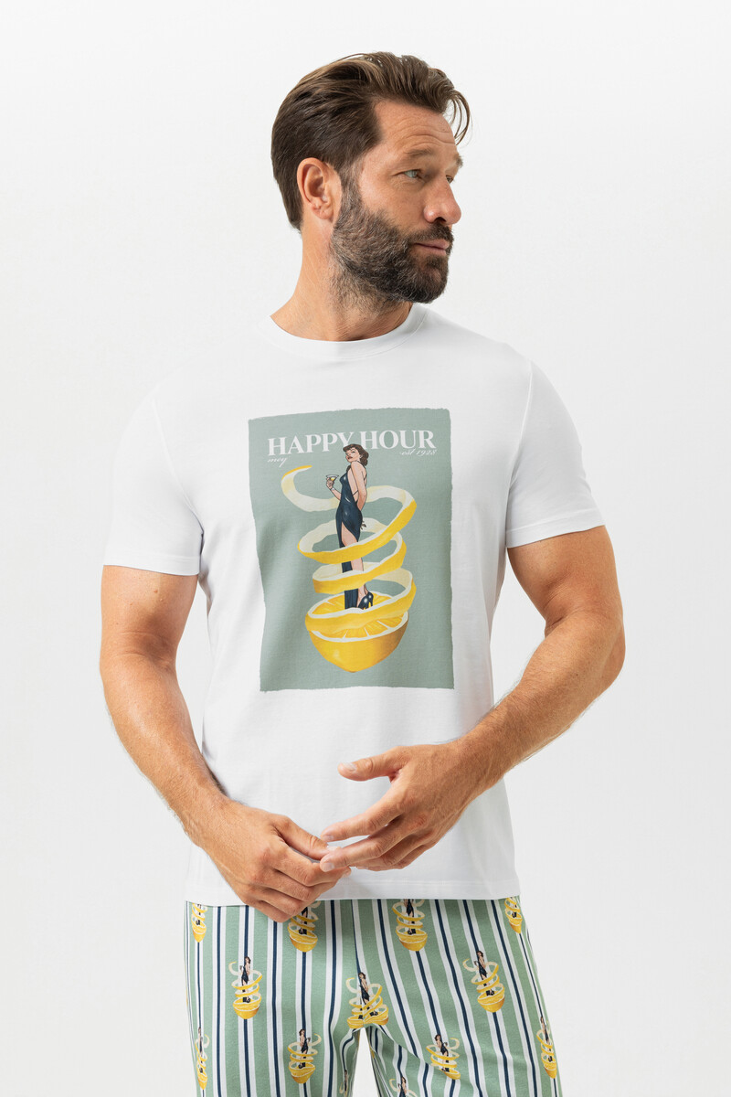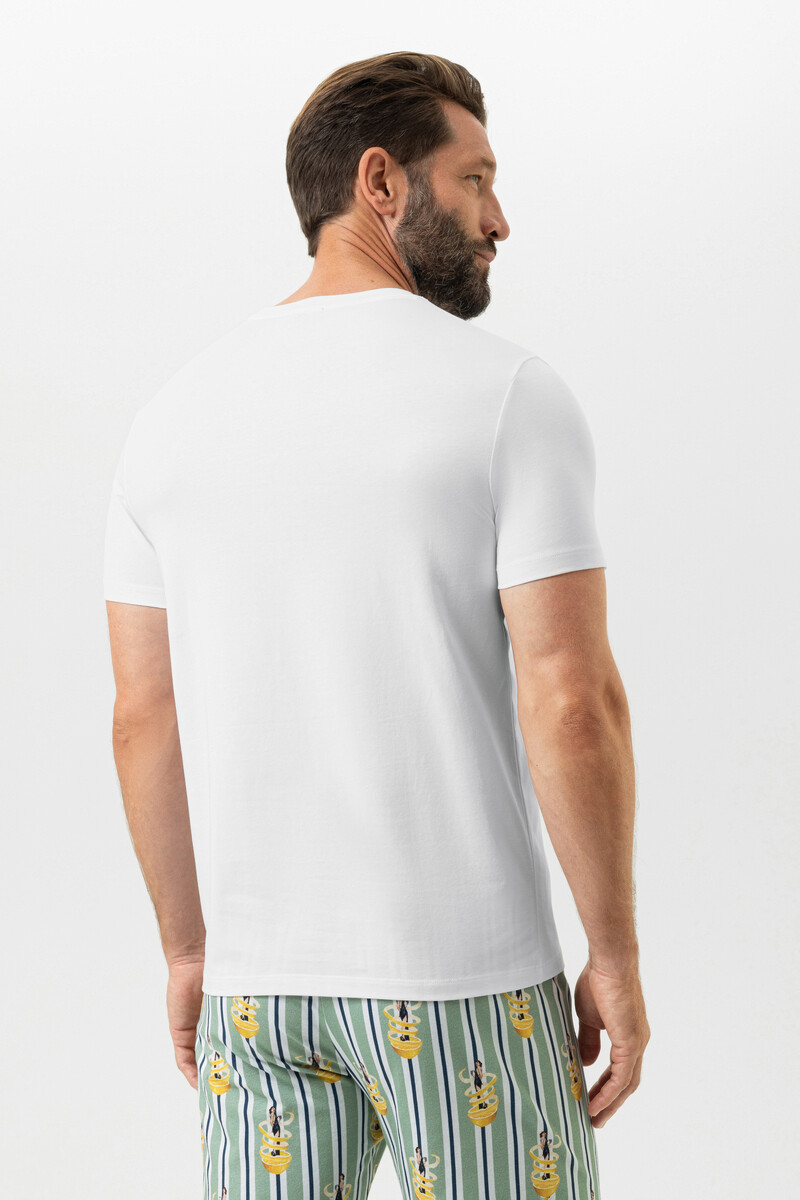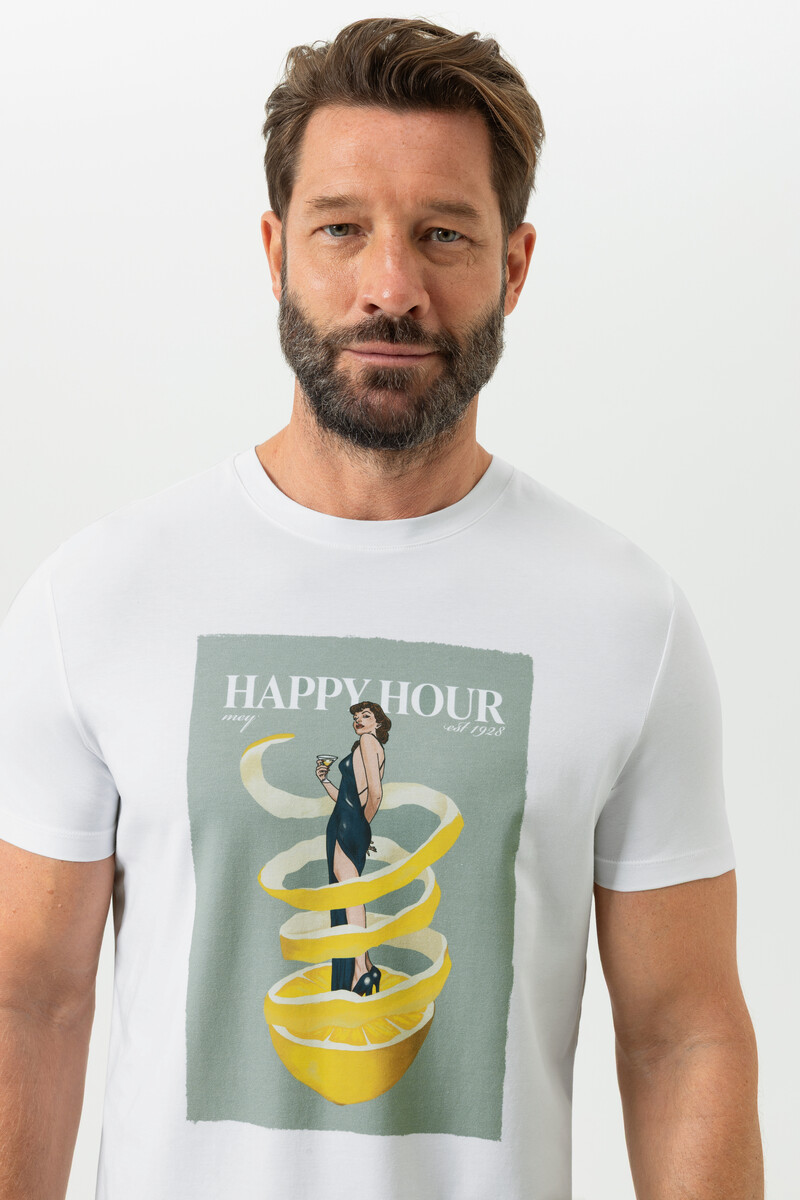 Мужская футболка Мей белого цвета с принтом в стиле пин ап - Mey SERIE FIZZ & FLAVOURS 2210027. Выполнена из высококачественного хлопка, соответствующего стандарту OEKO TEX standart 100 - качества, гипоаллергенность, безопасность. 95% хлопок, 5% эластан.