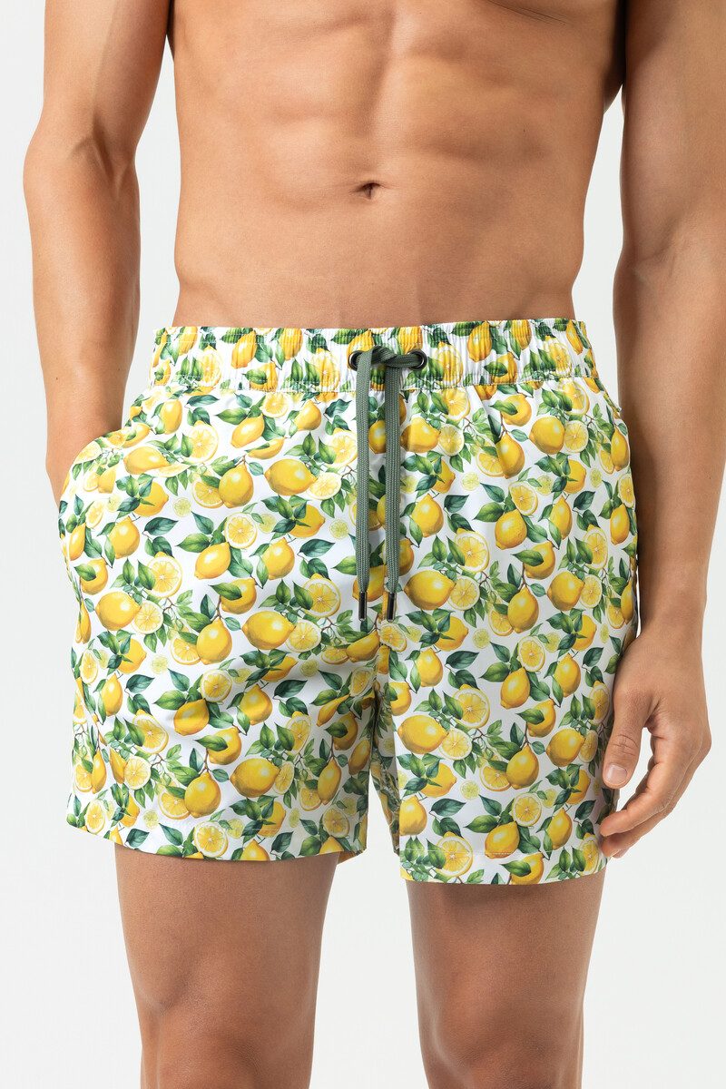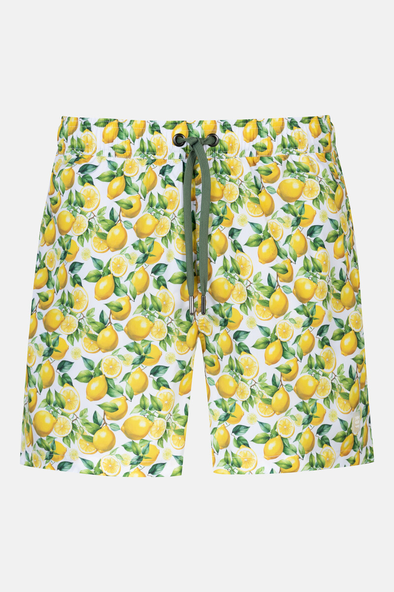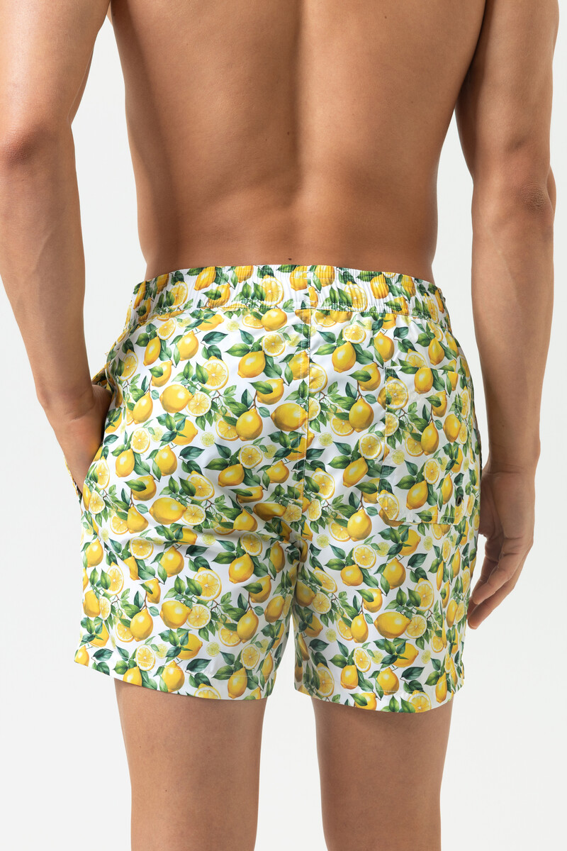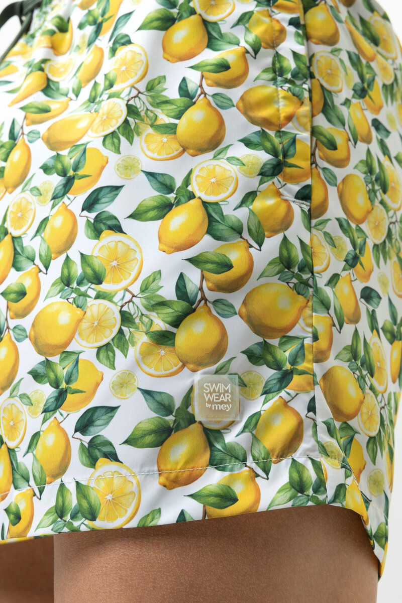 Мужские купальные плавки-шорты Мэй с принтом лимоны на белом фоне - Mey SERIE LEMON GROVE 2420035 Badeshort 1757 lemon twist. Плотная ткань, хорошо держит форму, не сминается. На широком поясе-резинке с регулировкой объема шнурком. По бокам - врезные карманы, сзади - накладной карман. Небольшой внутренний карман. Длина - до колена. Двухслойные, не подкладке. Выполнены из быстросохнущего материала.
