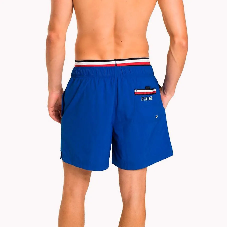 Ярко-синие плавки-шорты Томми Хилфигер с фирменным поясом-резинкой на шнуровке. Боковые карманы и карман сзади с яркой фирменной отделкой - окантовка-флаг и логотип.