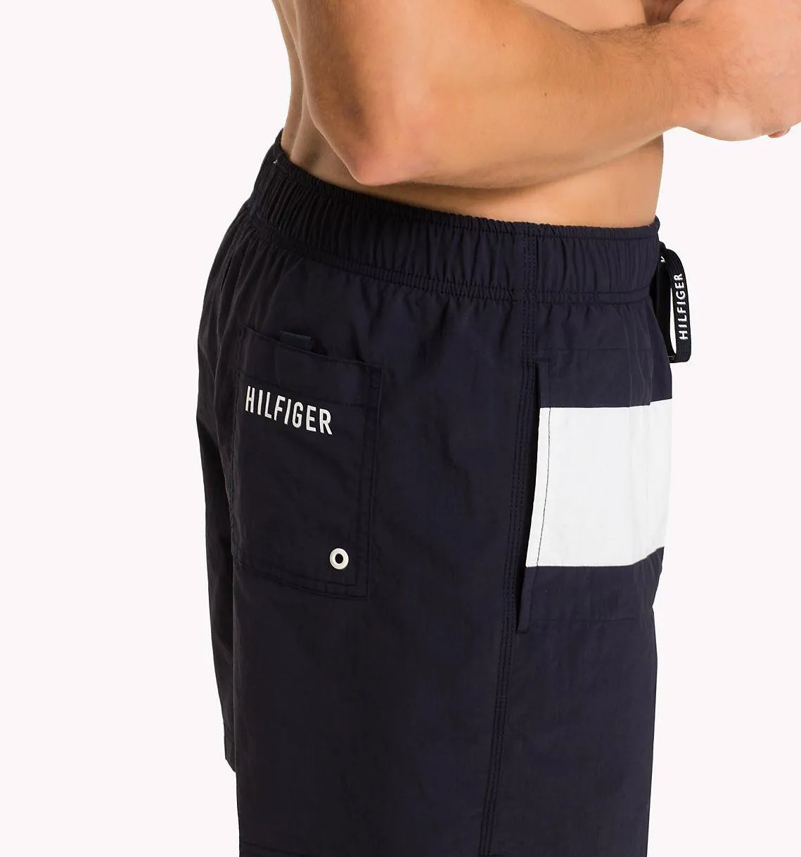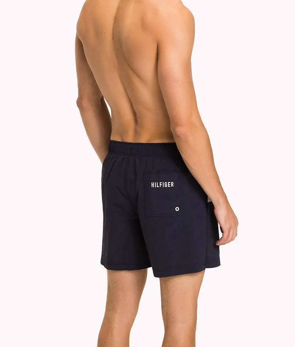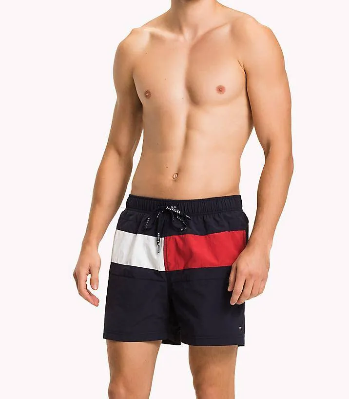 Плавки-шорты Томми Хилфигер Флаг - темно-синие с красными и белыми цветовыми блоками в традиционных цветах бренда. Пояс-резинка со шнуровкой, боковые карманы и карман сзади.