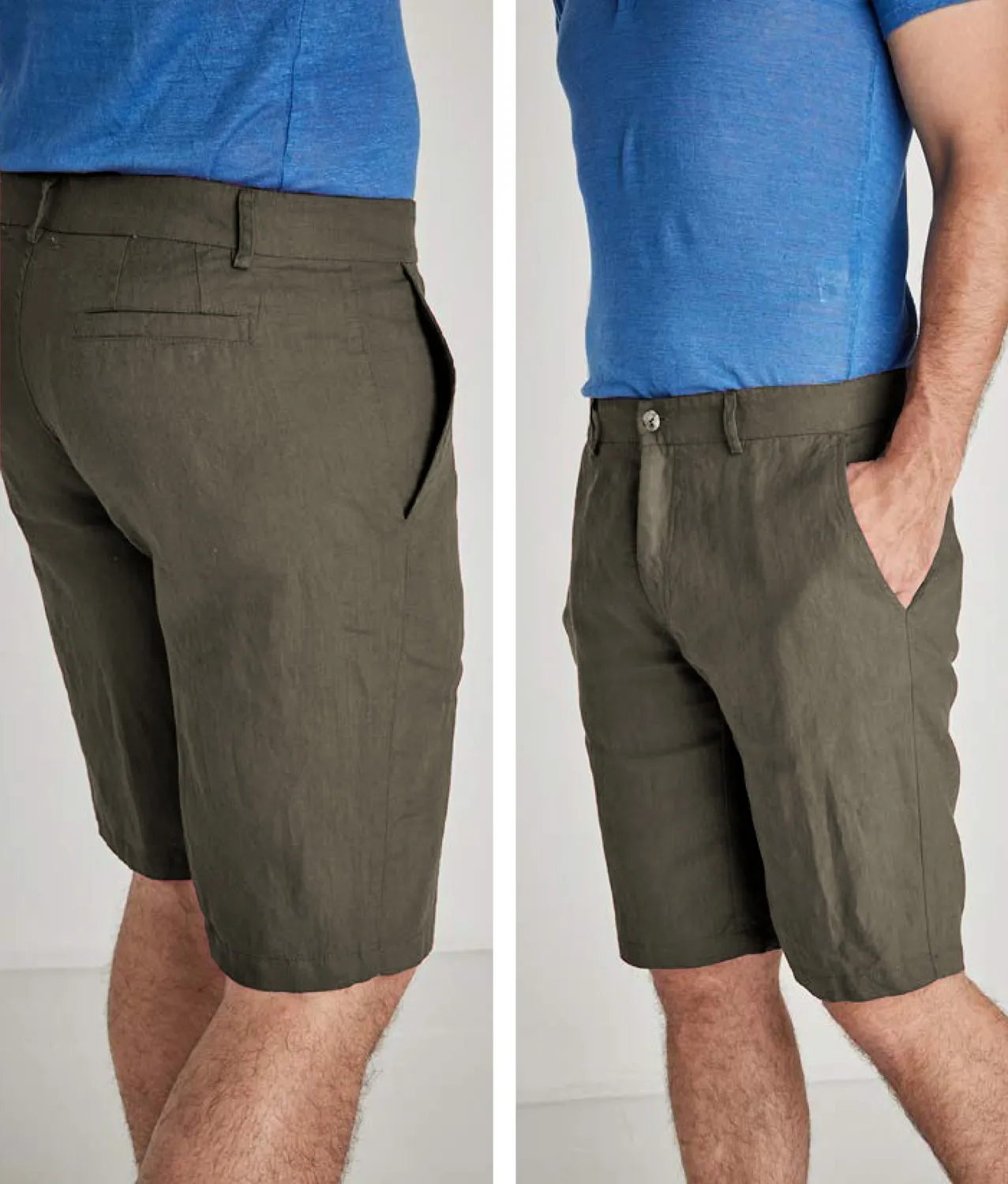 Мужские шорты LFDL La Fabbrica Del Lino цвета хаки - 100% натуральный лён. Классический брючный пояс и застежка, боковые и задние карманы.
