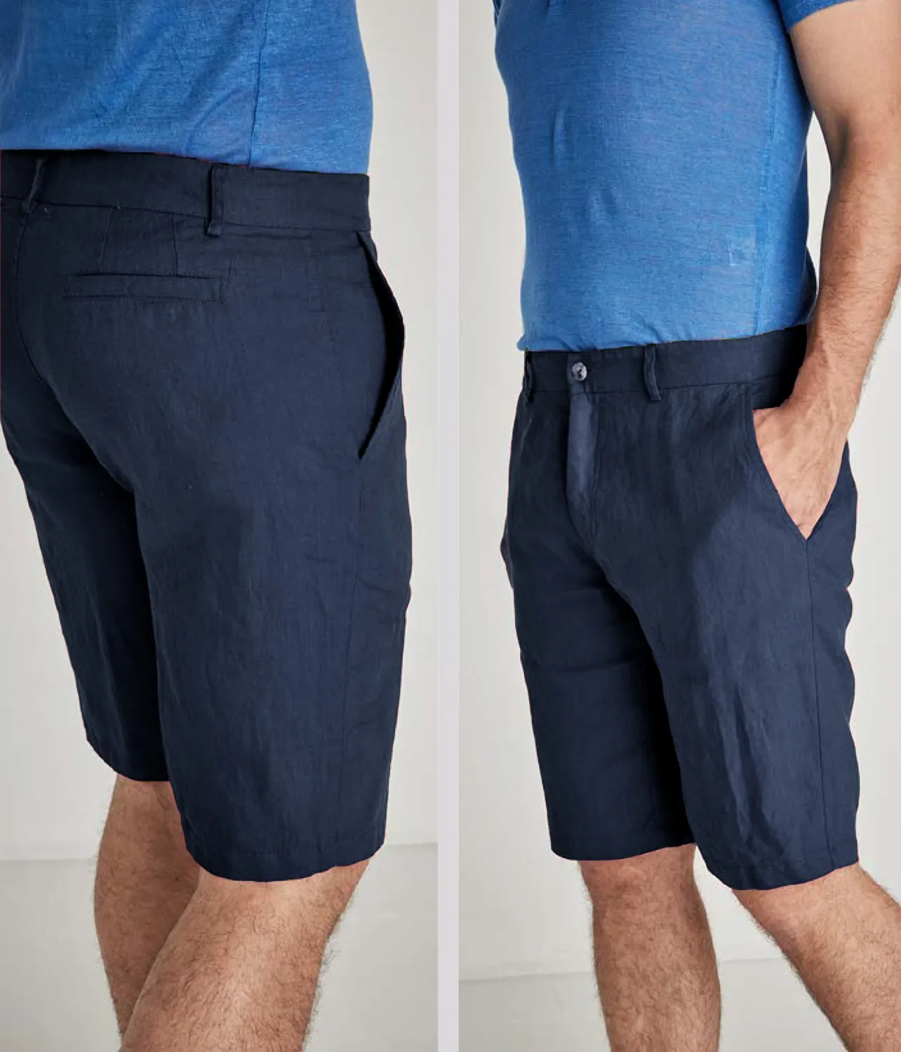 Мужские шорты LFDL La Fabbrica Del Lino тёмно-синего цвета нави - 100% натуральный лён. Классический брючный пояс и застежка, боковые и задние карманы.