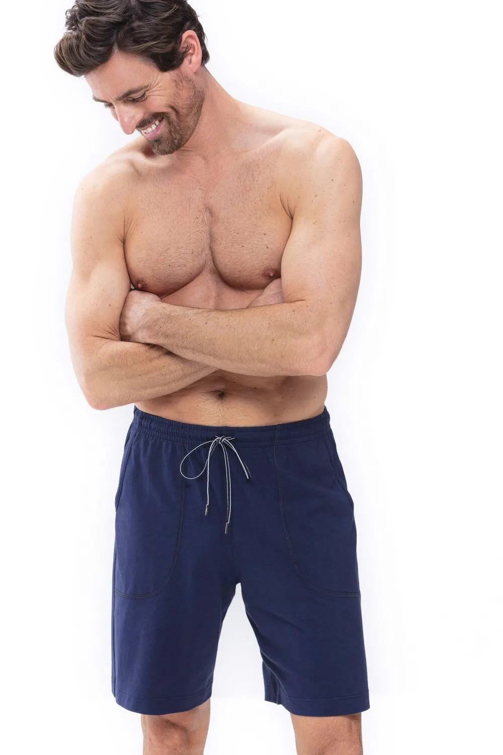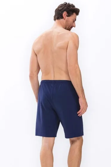 Мужские трикотажные шорты из хлопка Мэй тёмно-синего цвета - Mey 24650 668. Лёгкая дышащая ткань, хорошо пропускает воздух. 100% хлопок. На широком поясе-резинке с регулировкой объема шнурком. Два боковых врезных кармана с декоративной отстрочкой.