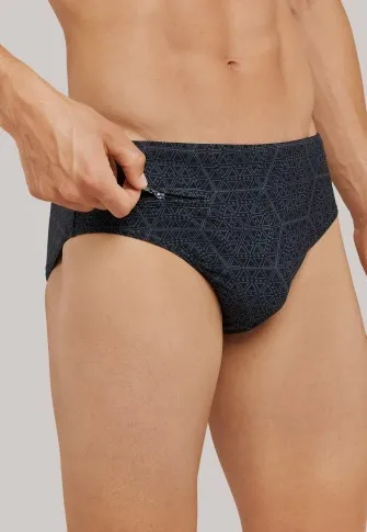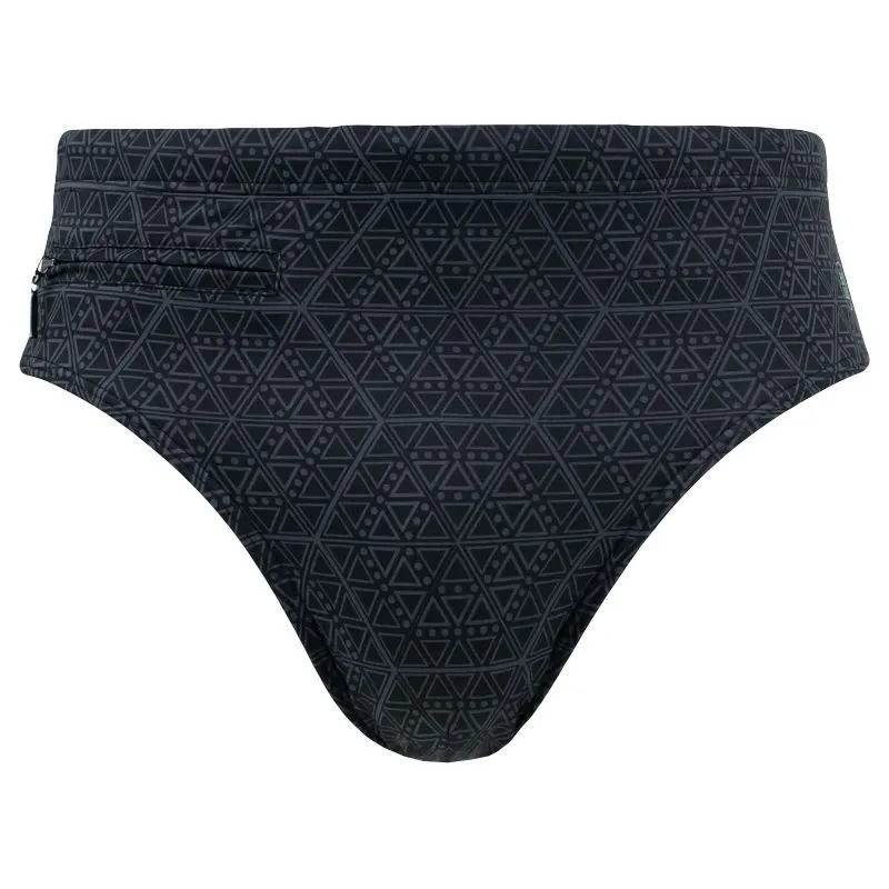 Классические плавки-слип Шиссер черные с неконтрастным геометрическим принтом. Маленьких карман на молнии.