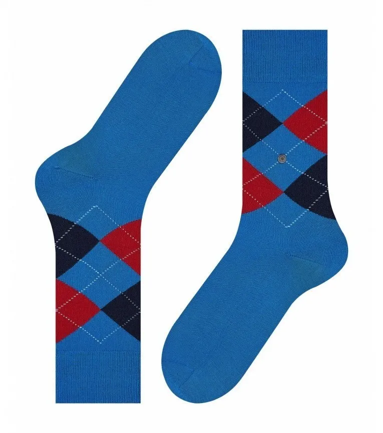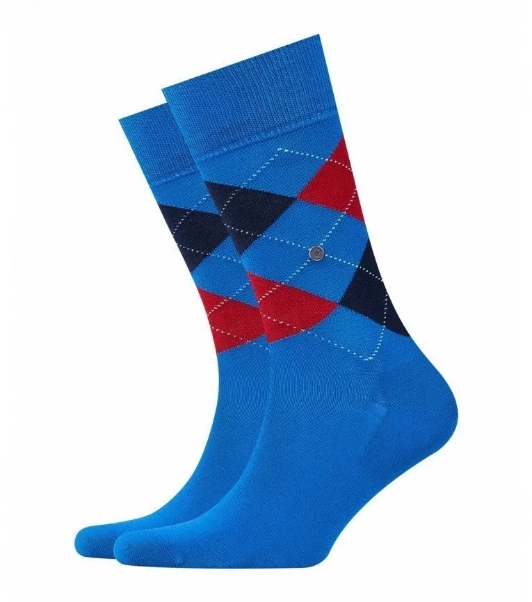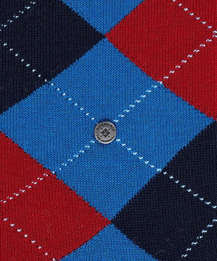 Синие мужские носки Берлингтон Манчестер с традиционным орнаментом аргайл с синими и красными ромбами. Гладкая текстура. 85% хлопка в составе. Добавлена синтетическая нить для лучшей посадки