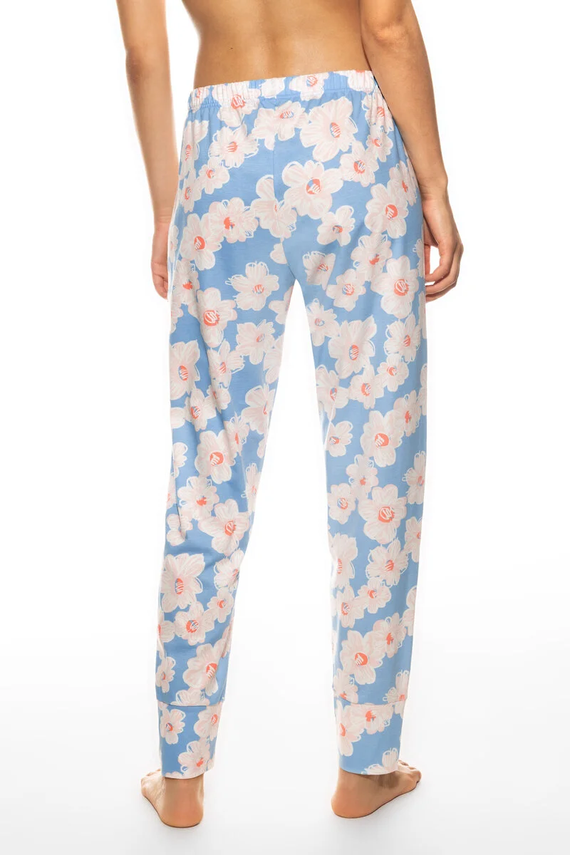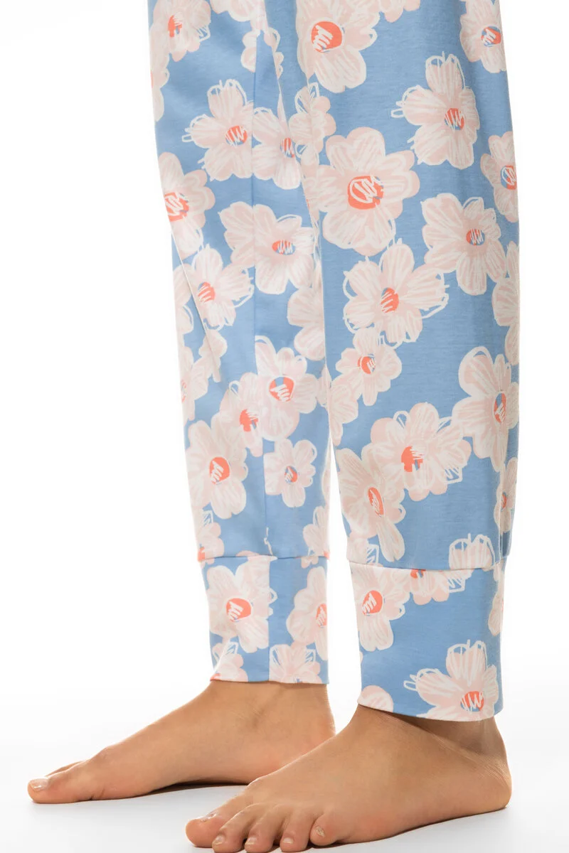 Хлопковые брюки Мэй с розовыми цветочками на голубом фоне - Mey pants 7/8 length 17596 544 angel blue. 100% хлопок. Это изделие соответствует сертификату Oeko-Tex-Standard 100 - ткань выполнена из экологичных и безопасных для кожи материалов. Зауженные брючины на широких манжетах, широкий пояс-резинка.