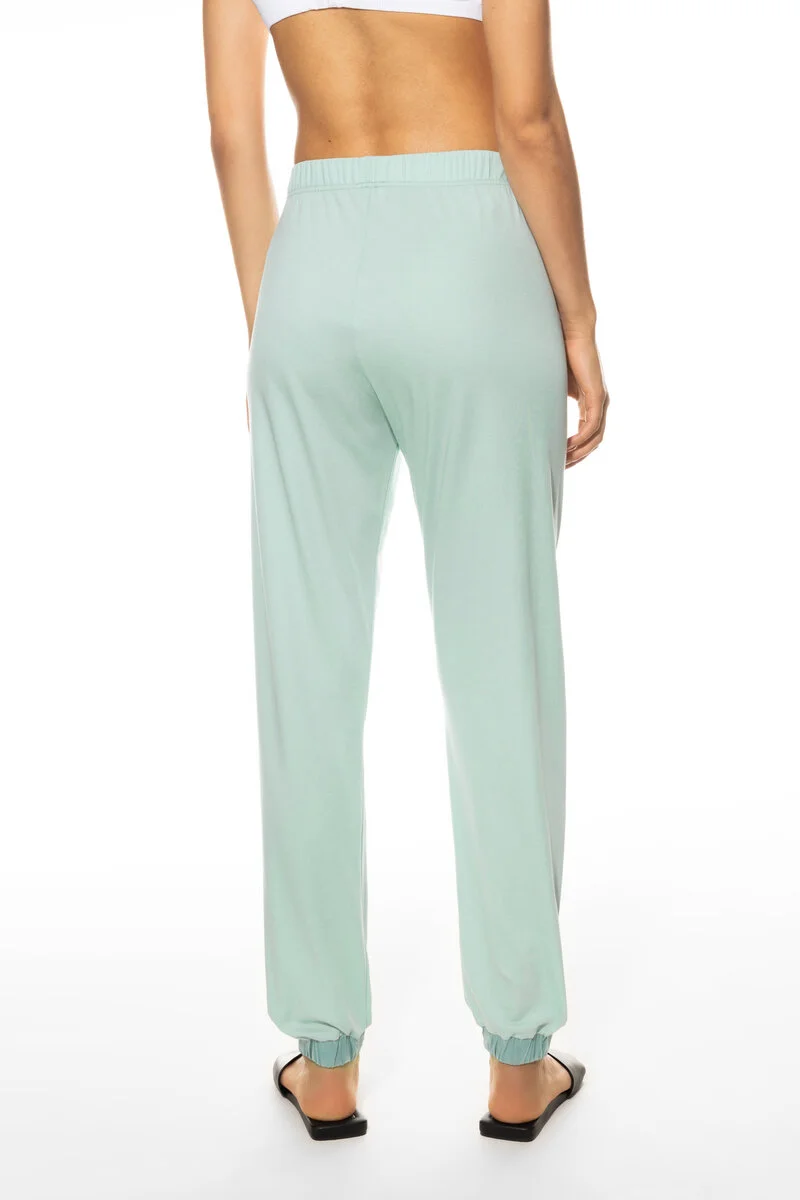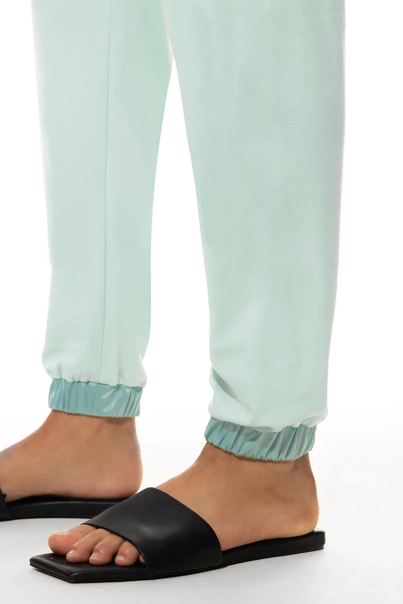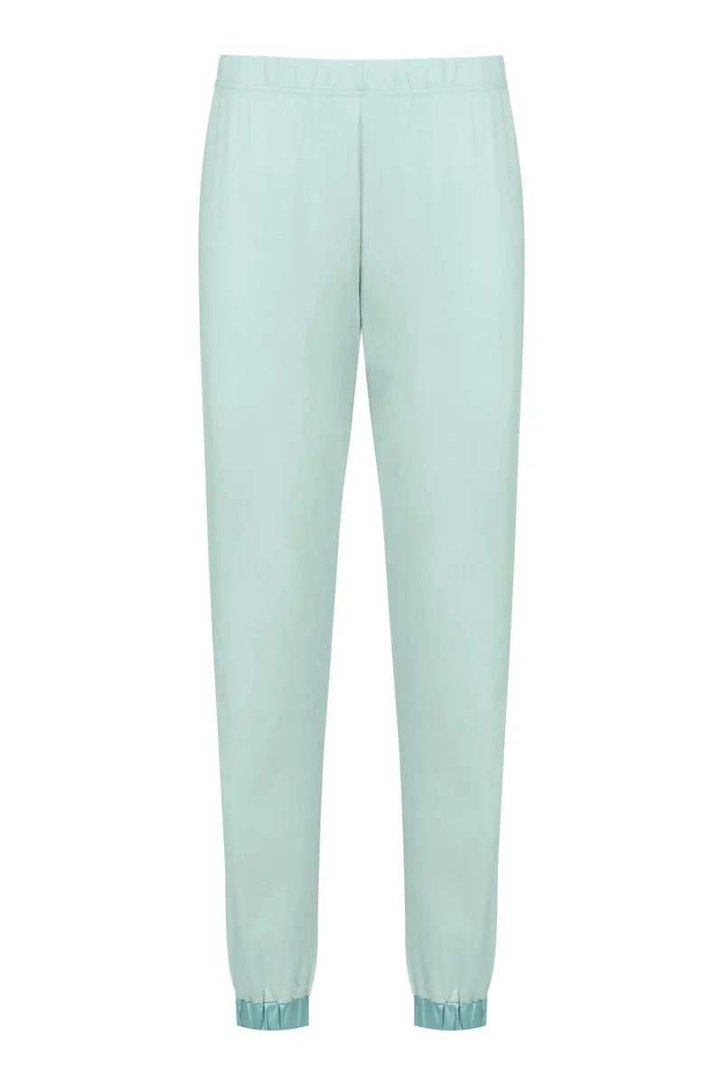 Пижамные брюки Мей Мали светло-зеленого цвета мята - Mey Serie Malea 17258 449 Sea Glass Light. 100% хлопковый трикотаж роскошного качества, экологически чистый, органический хлопок, соответствующий OEKO TEX Standart100. Штаны на эластичном поясе-резинке, зауженные к низу, на эластичной широкой манжете. Эффектная деталь - манжет выполнена из шелковисто-сатинового материала.