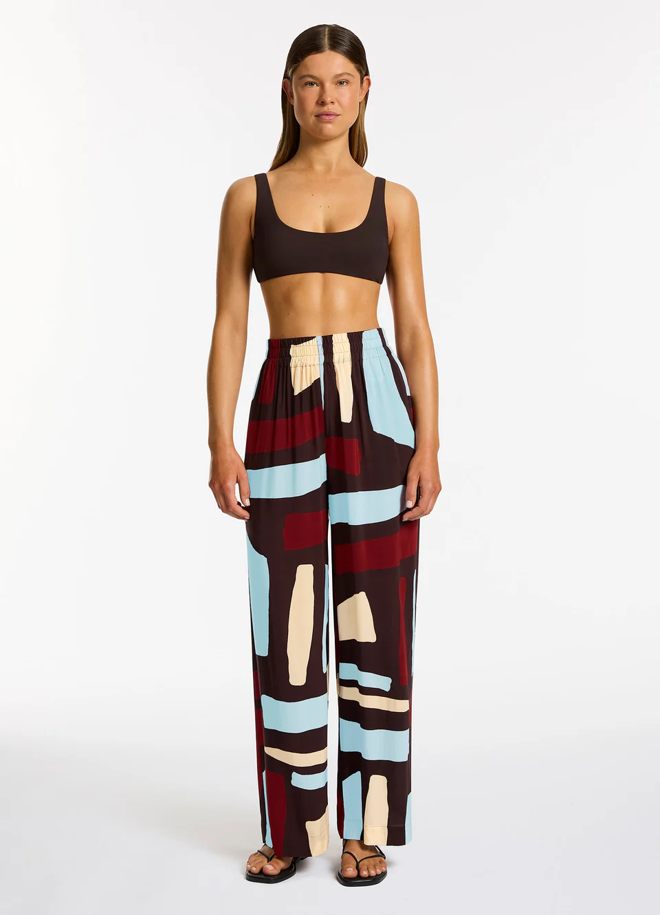 Лёгкие летние брюки-палаццо Джетс Индент Руби с геометрическим принтом в оттенках бордового и голубого - Jets Indent Zarla Wide Leg Pant Ruby J61377. Выполнены из лёгкого струящегося материала - 100% вискоза, текстильное плотно. Брюки на широком поясе-резинке с лёгкой сборкой у талии. По бокам - внутренние карманы. Эффектный принт с крупными деталями.